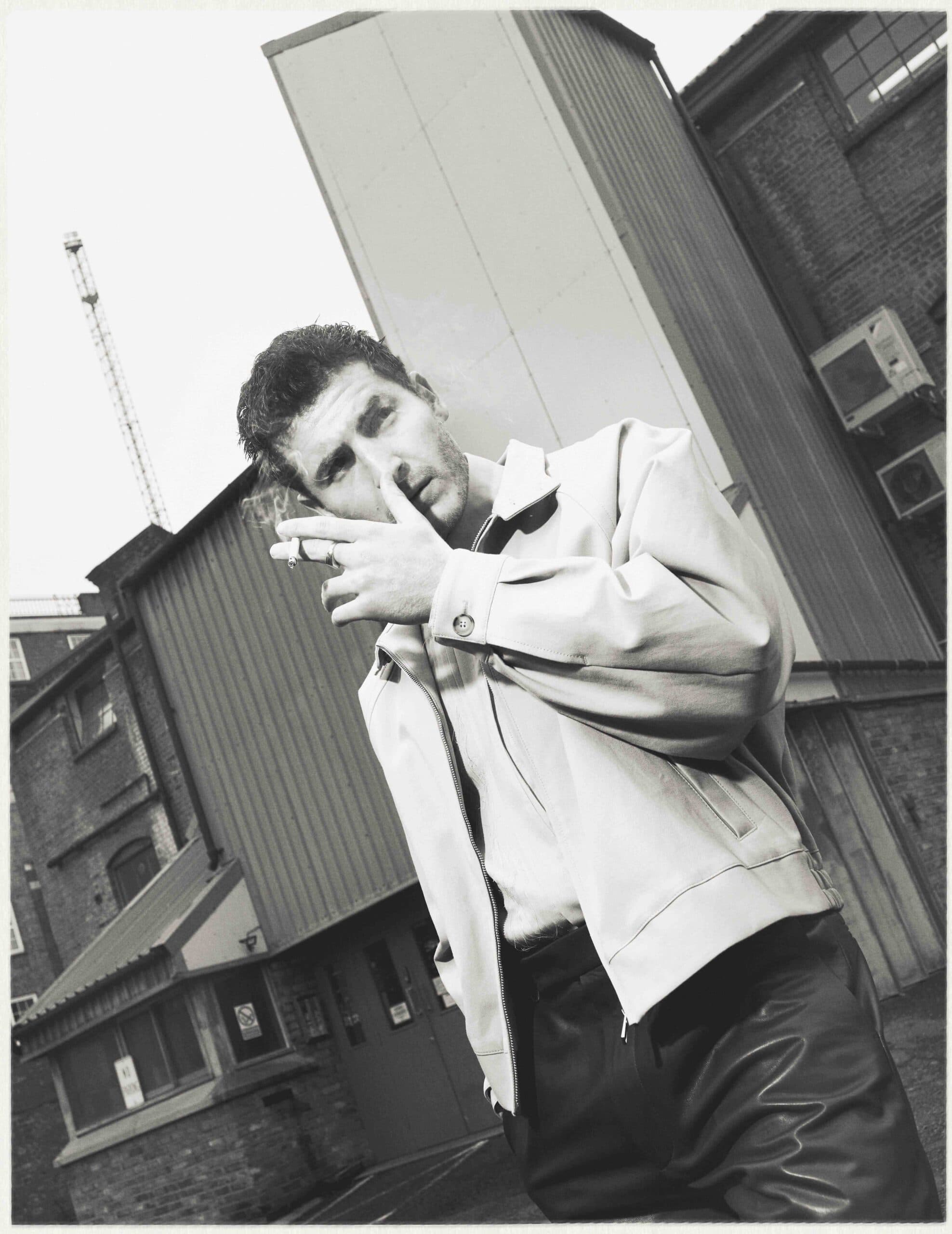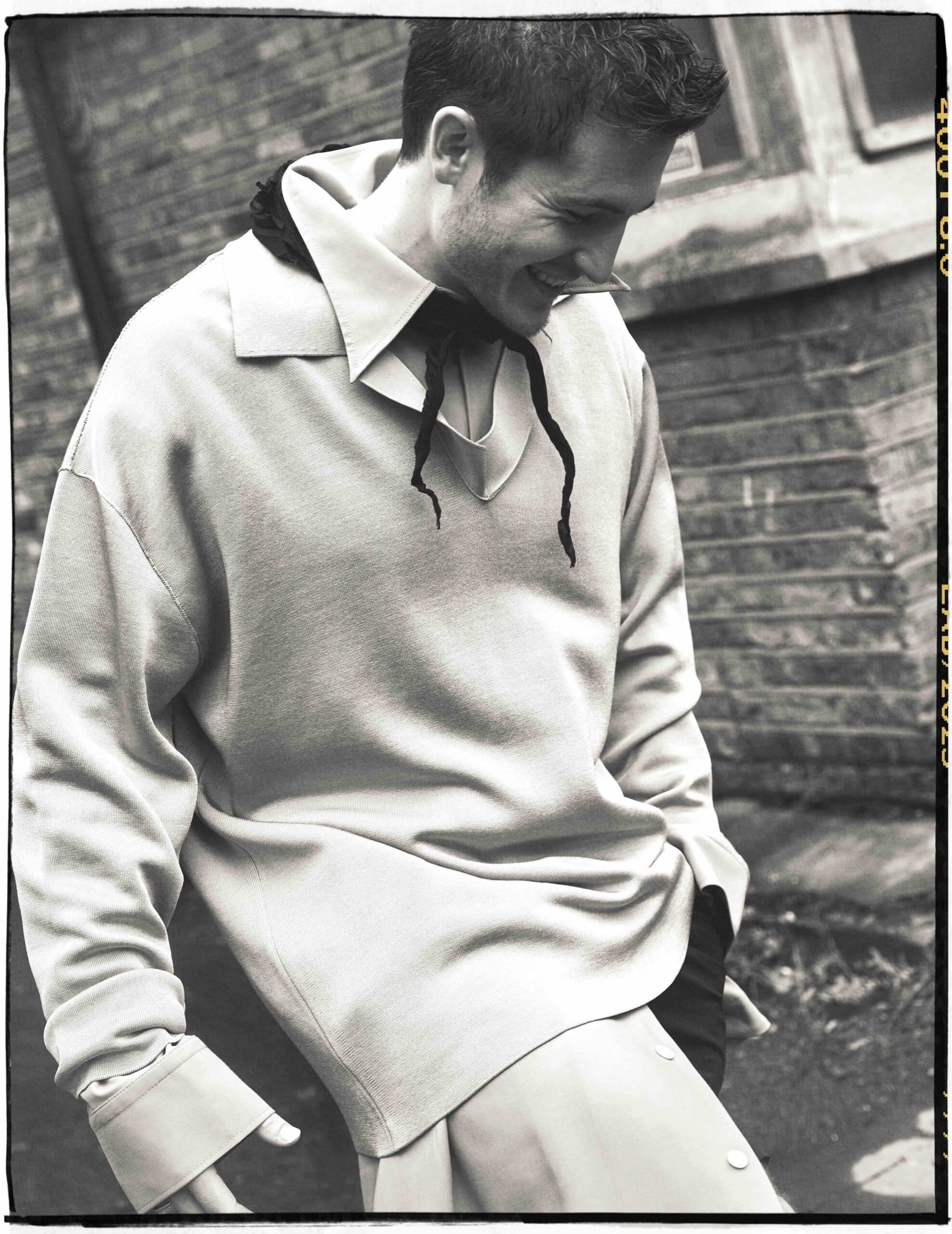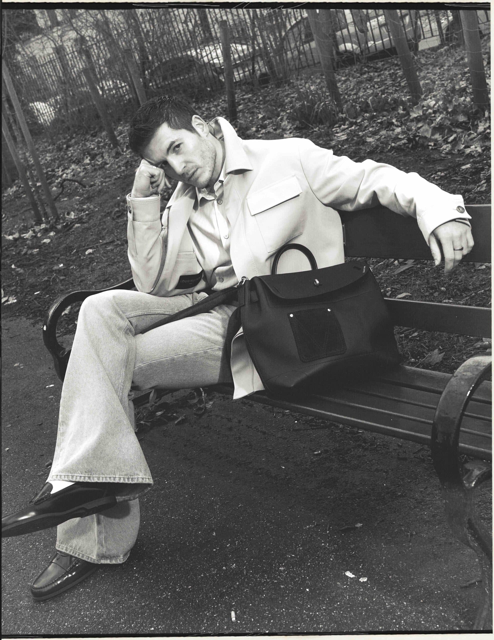 Kieron wears jacket, jumper, shirt, trousers and bag by LOUIS VUITTON.