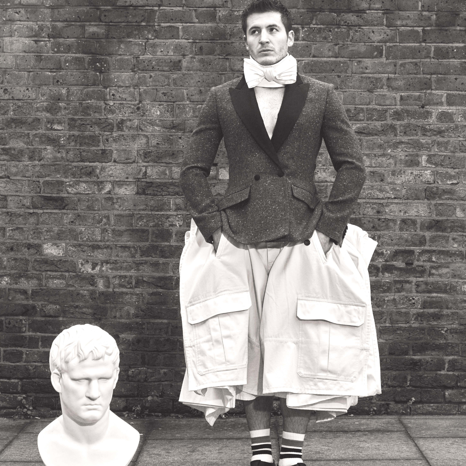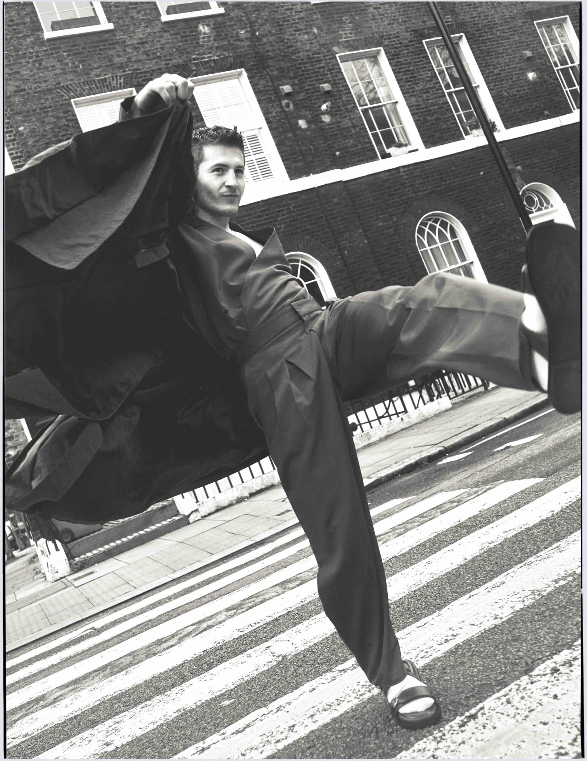 Kieron wears shirt, trousers, sandals and socks by FERRARI Style and jacket by DAVID KOMA.