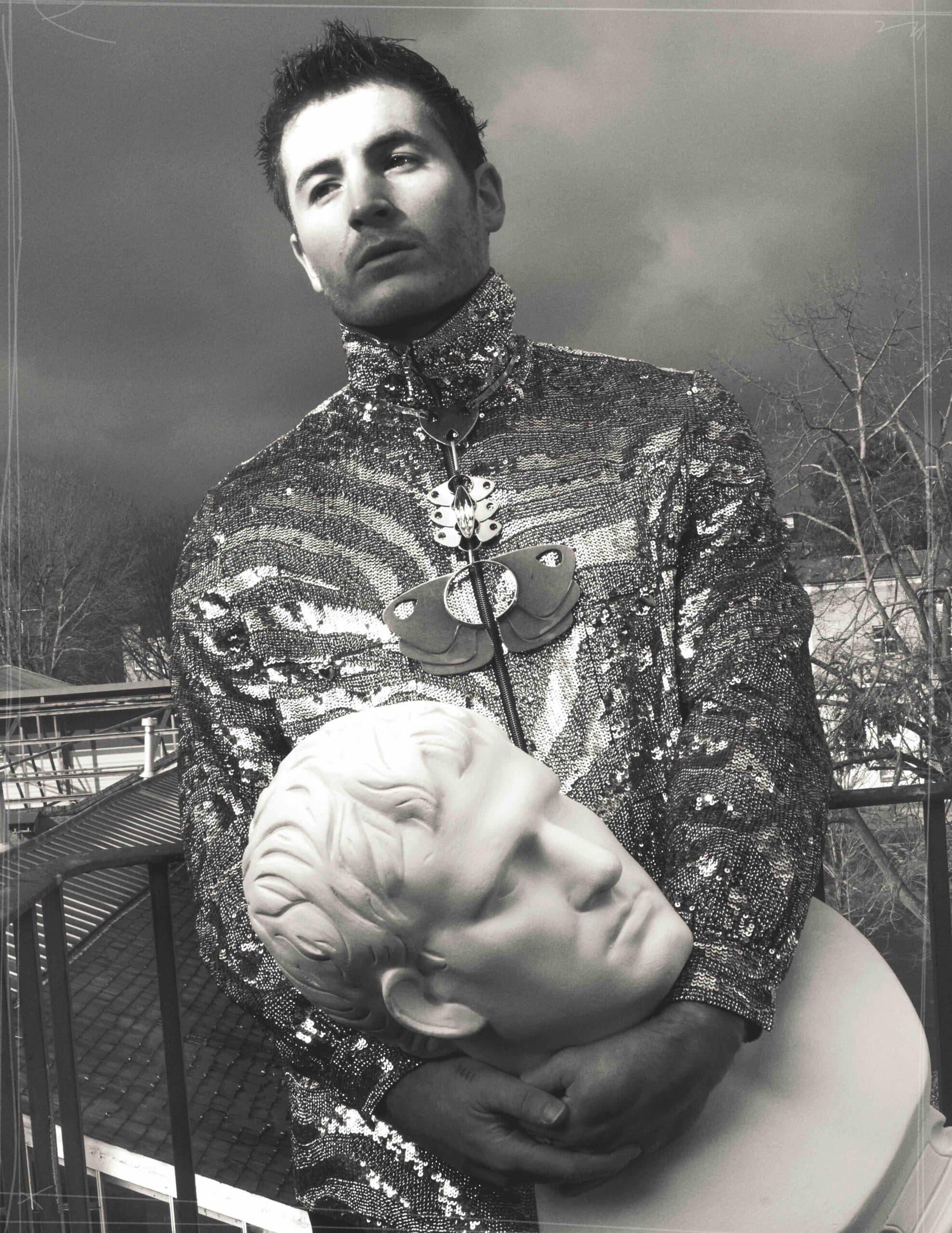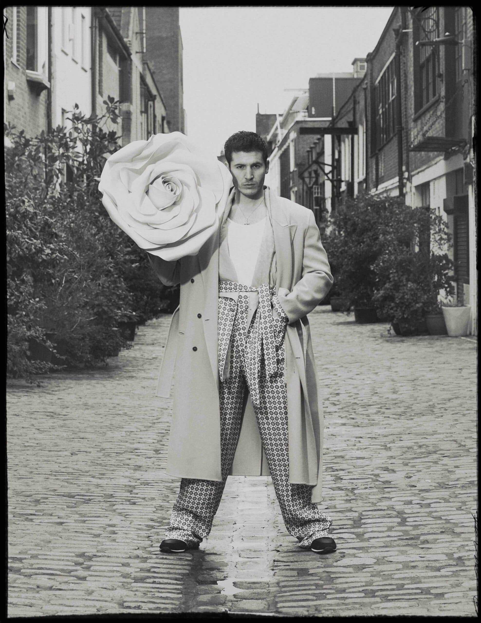 Kieron wears jacket and necklace by VALENTINO.