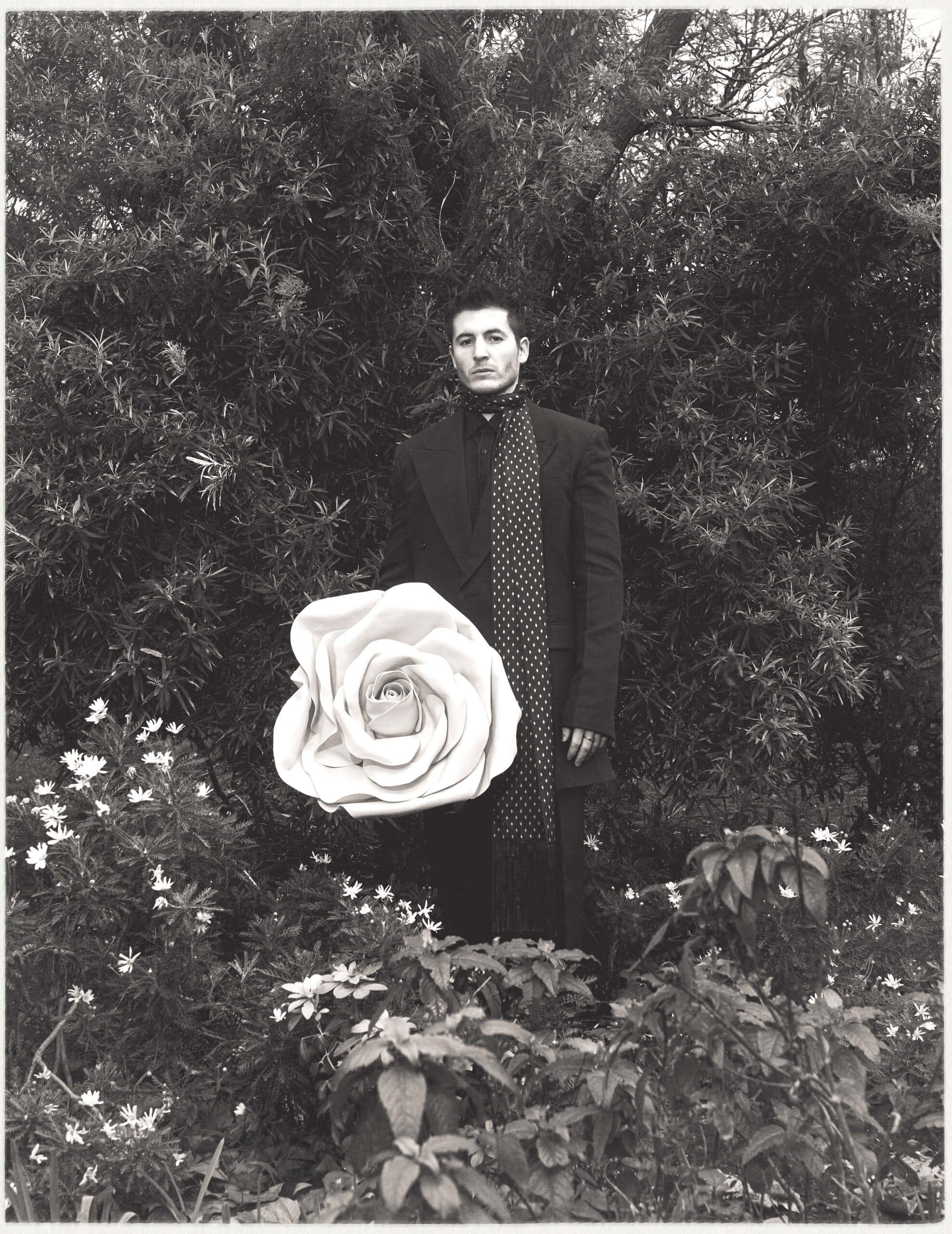Kieron wears jacket, shirt, trousers and scarf by FERRAGAMO.