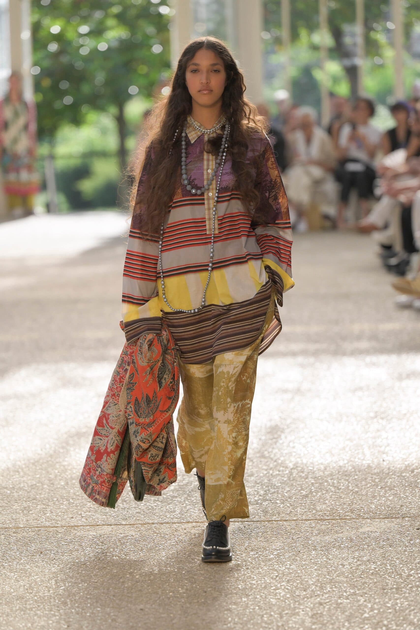 Hot off the back of their first LFW show in earlier in June, Denzilpatrick’s SS25 collection gets its inspiration from leisure and working class uniforms — it transports you back to summer days at the lido, or lazy days spent in a tracksuit. Technical materials are juxtapositioned with sheer drape fabric and soft silk, and pieces even feature artwork made by Bosley.