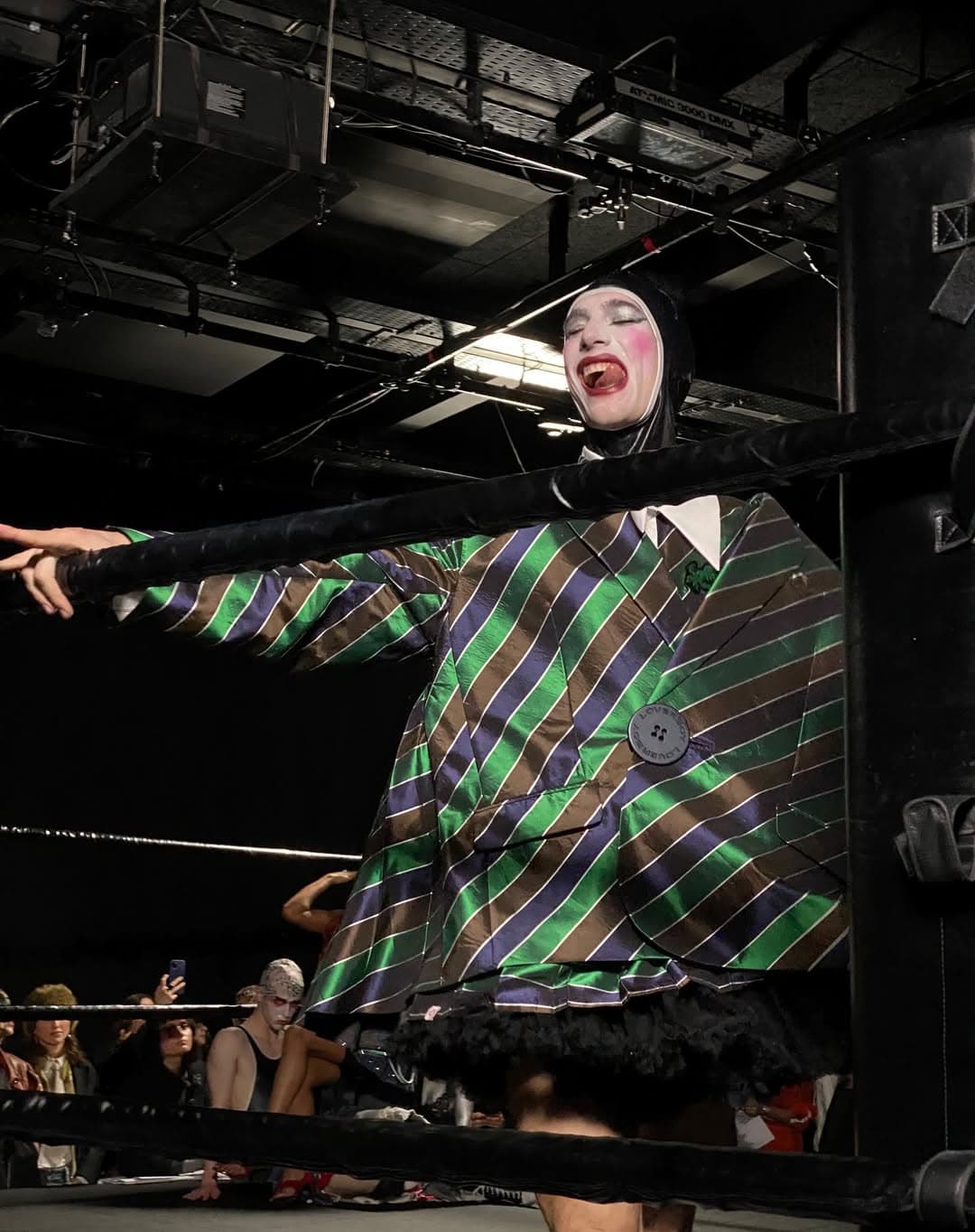 After a while, all the shows at fashion week start to blur into one. Charles Jeffrey, though, made sure that wouldn’t happen for him when he decided to turn Dover Street Market Paris into a wrestling ring. In true Charles Jeffrey style, though, it was a completely queerified version of wrestling (even though the sport is undeniably homoerotic as it is). And the match wasn’t just part of the show — it was literally the whole thing. The music and dance duo Bullyache displayed the collection (a fantastical take on Victorian English garbs) over a seventy-five minute theatrical spectacle. Oh, and did we forget to mention that the punkish Scottish designer also paired up with Pornhub for the event? That happened too — but you’ll have to Google it for yourself.
