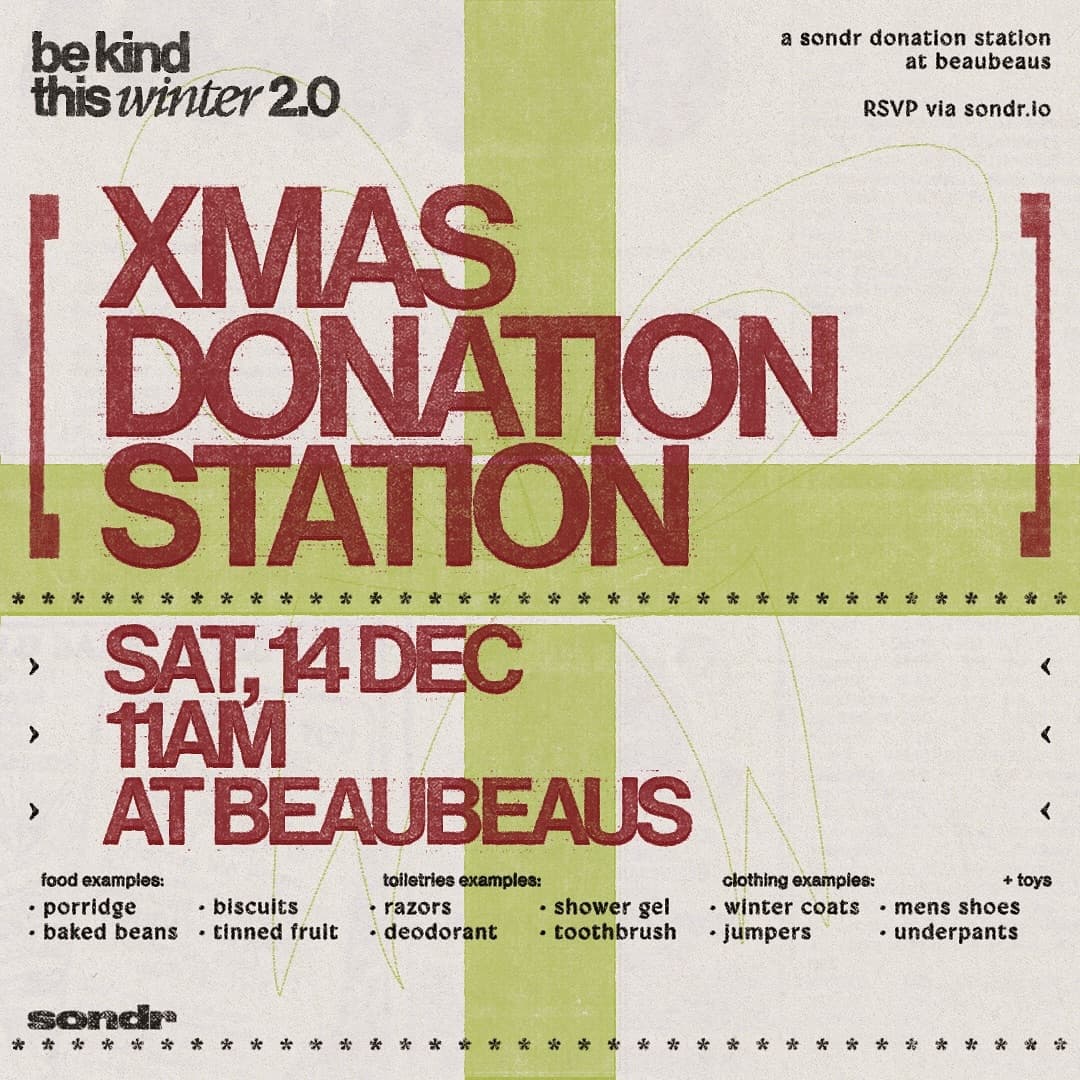 While it’s easy to get bogged down with all the not-so-important stuff, we’ve got to remember that Christmas is all about giving. More than that, it’s all about giving back in whatever way you can. That’s why second on our list is BeauBeaus, which is, of course, helmed by our cover star Olaolu Slawn. This Saturday, it’s time for the east London cafe-stroke-creative-hangout’s annual donation station. Linking up, yet again, with Sondr (another one to put on your radar), they’re asking everyone to pop down and donate food, toiletries, clothing, toys and books. There’ll be a whole load of Christmassy festivities, too. More information here.