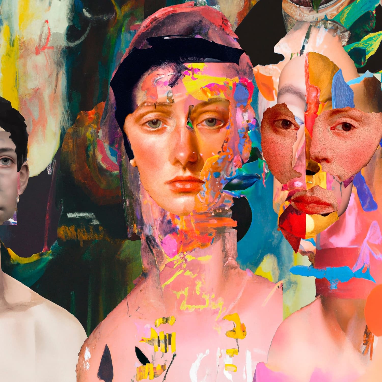 The results of these tests are a chaotic fusion of glitchy digital gradients, bright colours and partially deconstructed faces. At times, they blur the line between mediums. Is the crackling paint across a classical portrait real, or a digital add-on? Is the paper really peeling from the surface, or is that an imprint from SnowSkull’s dialogue with the machine? While these descriptions sound a touch apocalyptic, NoMansLand is unmistakably lively — a screenshot of a world where our relationship to technology is one of excitement, not scepticism or fear.