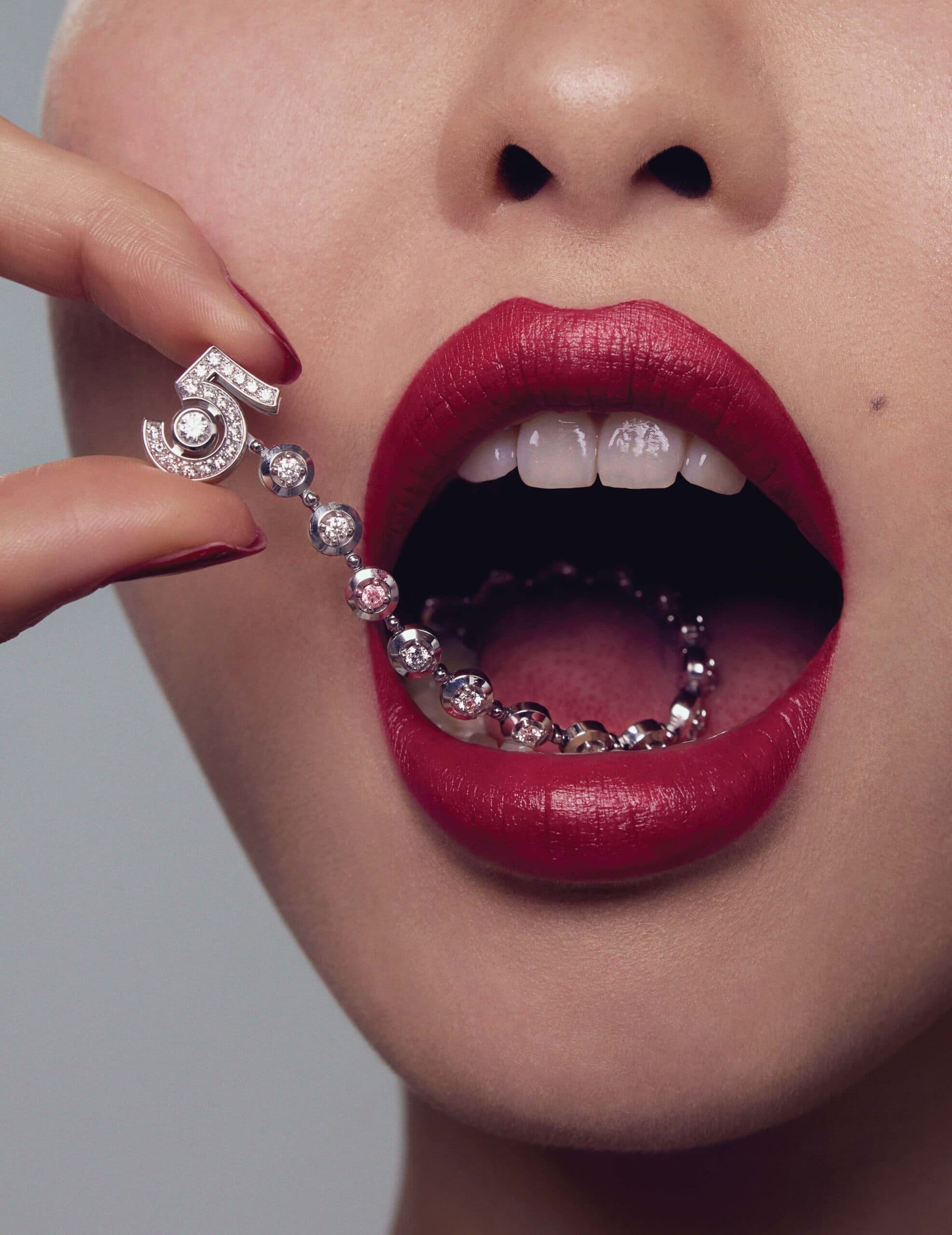 Nomin wears CHANEL Le Lift Crème, CHANEL Les Beiges foundation in BD11 and CHANEL Poudre Universelle Libre in 10 Light on skin, Les Signes de CHANEL Illuminating Powder blush in 997 Rose Lumière on cheeks, CHANEL Rouge Allure Velvet lipstick in 549 Rouge Vie on lips and CHANEL Le Vernis in 369 Alchimiste on nails and CHANEL La Crème Main on hands. Nomin wears Eternal N°5 diamond line bracelet in 18-carat white gold and diamonds by CHANEL Fine Jewellery.