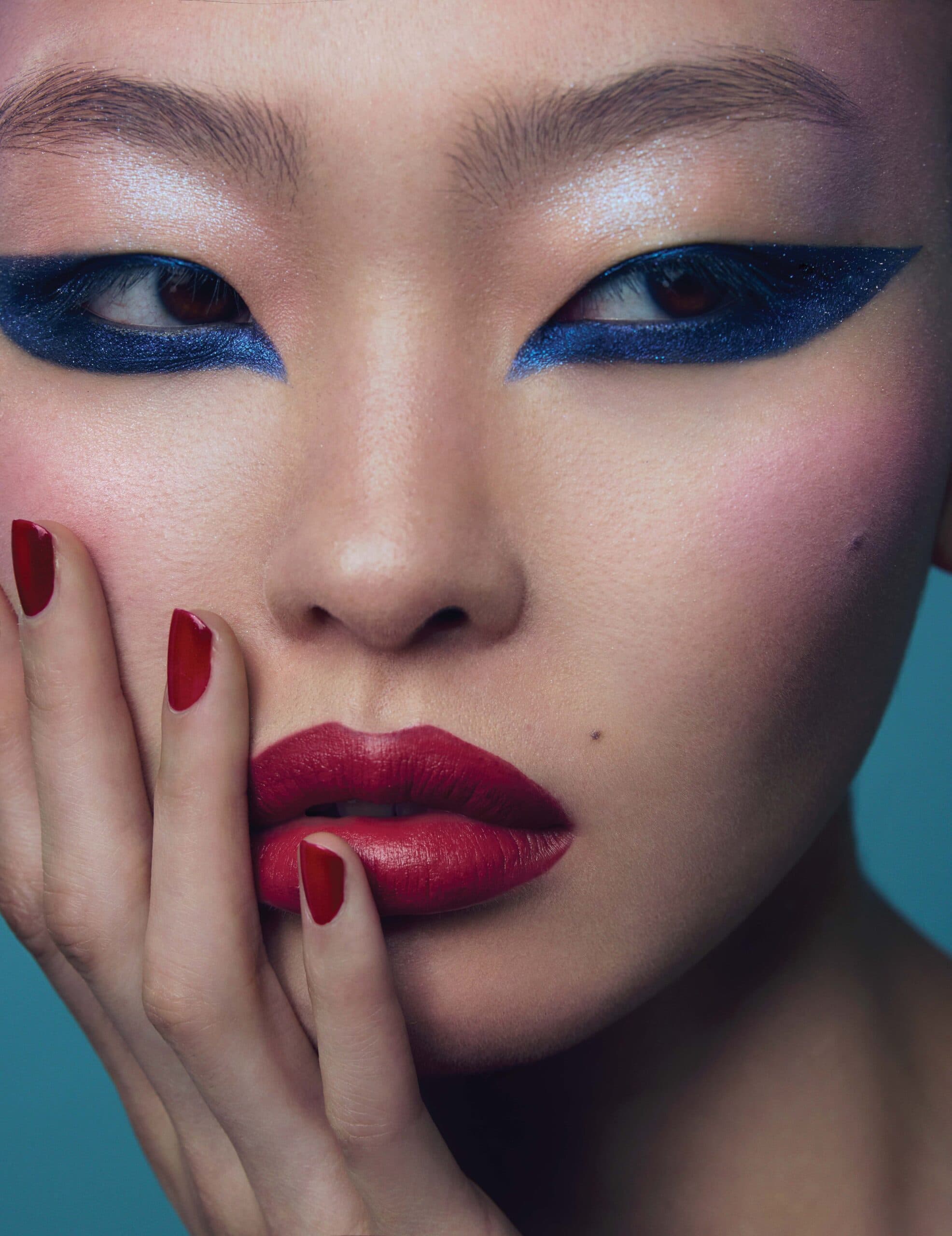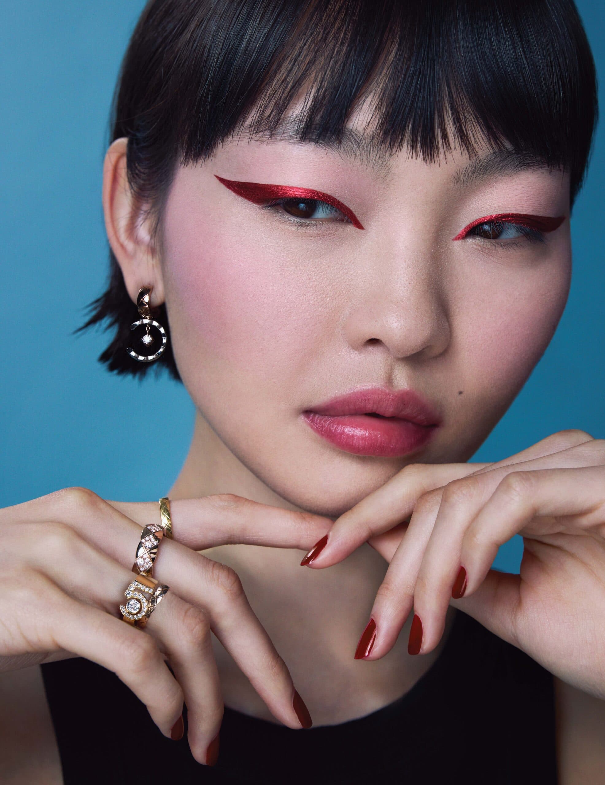 CHANEL Le Gel Sourcils in 350 Transparent on brows, CHANEL Noir Allure mascara in 77 Anthracite on lashes, Le Liner De CHANEL Liquid liner in 544 Écarlate on eyes, Les Signes de CHANEL Illuminating Powder blush in 997 Rose Lumière on cheeks, CHANEL Rouge Allure Velvet lipstick in 548 Abstrait on lips and CHANEL Le Vernis in 369 Alchimiste on nails and CHANEL La Crème Main on hands. Nomin wears Coco earrings quilted motif in 18-carat white and beige gold and diamonds, Coco Crush mini version ring with quilted motif in 18-carat yellow gold, Coco Crush small version ring with quilted motif in 18-carat beige gold and diamonds, Eternal N°5 ring in 18-carat yellow gold and diamonds and Coco Crush mini version ring with quilted in 18-carat beige gold and diamonds by CHANEL Fine Jewellery.
