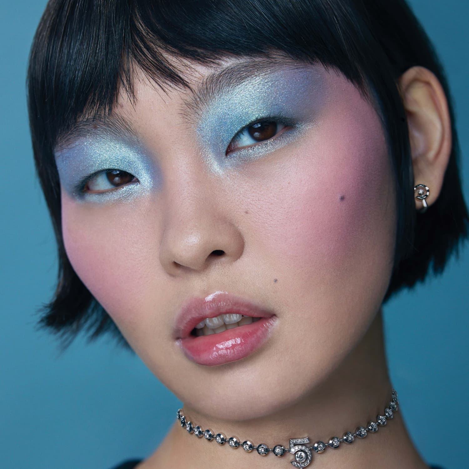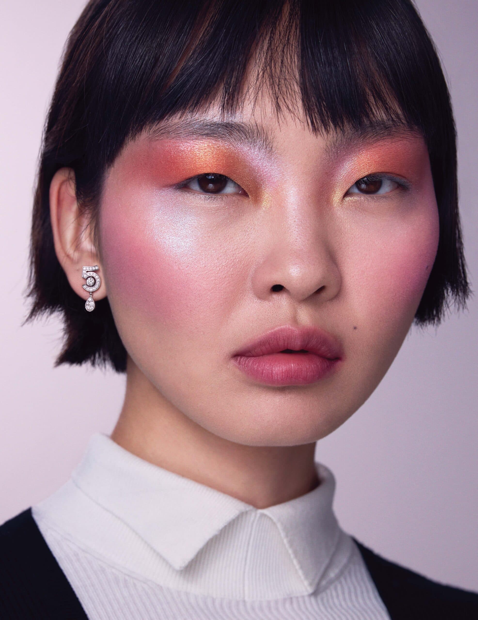 Nomin wears CHANEL Le Lift Crème, CHANEL Les Beiges foundation in BD11 and CHANEL Poudre Universelle Libre in 10 Light on skin, CHANEL Le Gel Sourcils in 350 Transparent on brows, CHANEL Noir Allure mascara in 77 Anthracite on lashes, CHANEL Les 9 Ombres eyeshadow palette in 849 The Space Traveler on eyes, Les Signes de CHANEL Illuminating Powder blush in 997 Rose Lumière on cheeks and CHANEL Rouge Allure Velvet lipstick in 548 Abstrait on lips. Nomin wears Eternal N°5 asymmetrical transformable earrings in 18-carat white gold and diamonds by CHANEL Fine Jewellery.