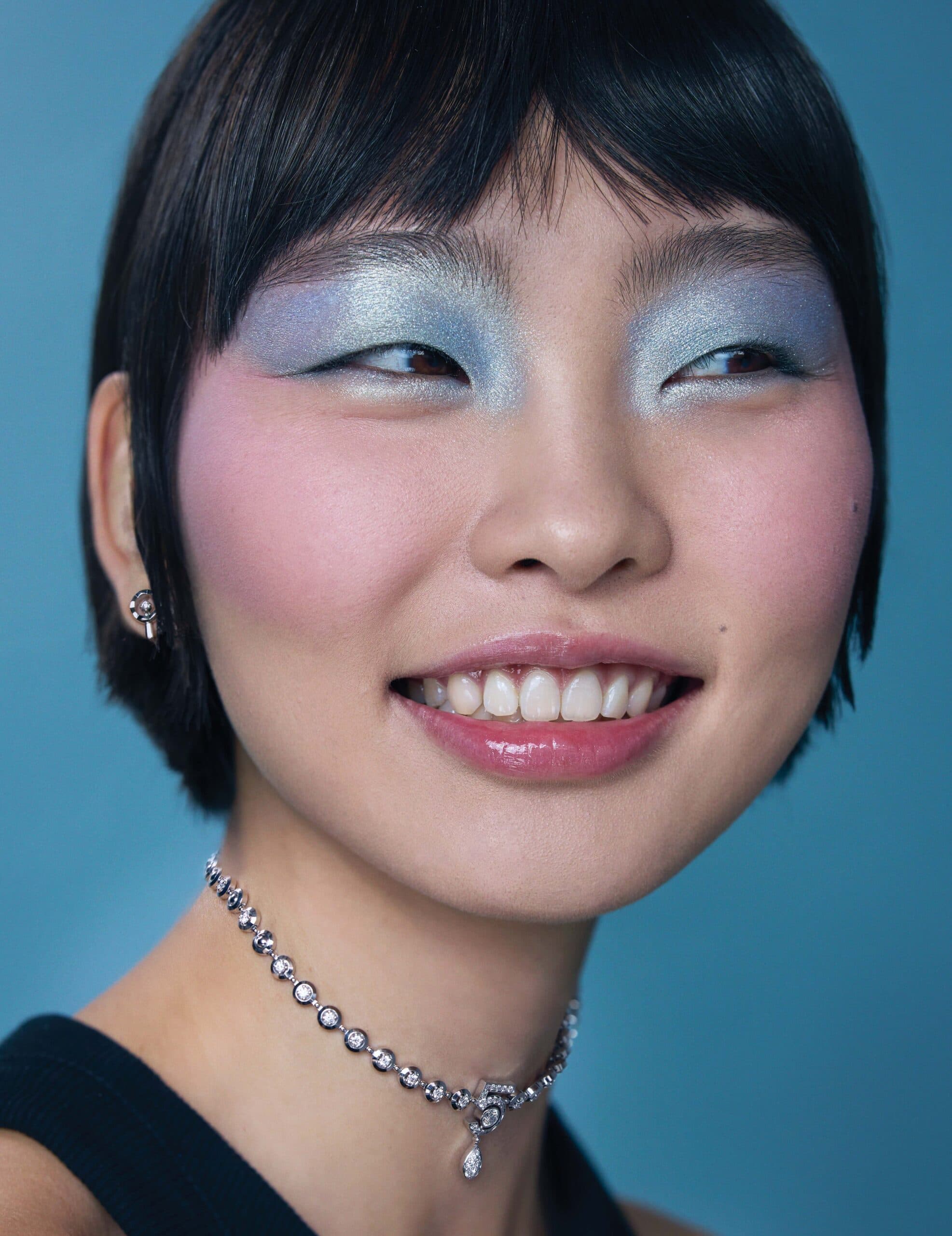 Nomin wears CHANEL Le Lift Crème, CHANEL Les Beiges foundation in BD11 and CHANEL Poudre Universelle Libre in 10 Light on skin, CHANEL Le Gel Sourcils in 350 Transparent on brows, CHANEL Noir Allure mascara in 77 Anthracite on lashes, Les Signes de CHANEL Illuminating powder blush in 997 Rose Lumière on cheeks, CHANEL Les 4 Ombres eyeshadow palette in 397 Nuit Astrale on eyes and CHANEL Rouge Allure Velvet lipstick in 548 Abstrait and CHANEL Rouge Coco lip gloss in 726 Icing on lips. Nomin wears Eternal N°5 diamond line necklace in 18-carat white gold and diamonds and Coco single earring clip with quilted motif in 18-carat white gold and diamond by CHANEL Fine Jewellery.