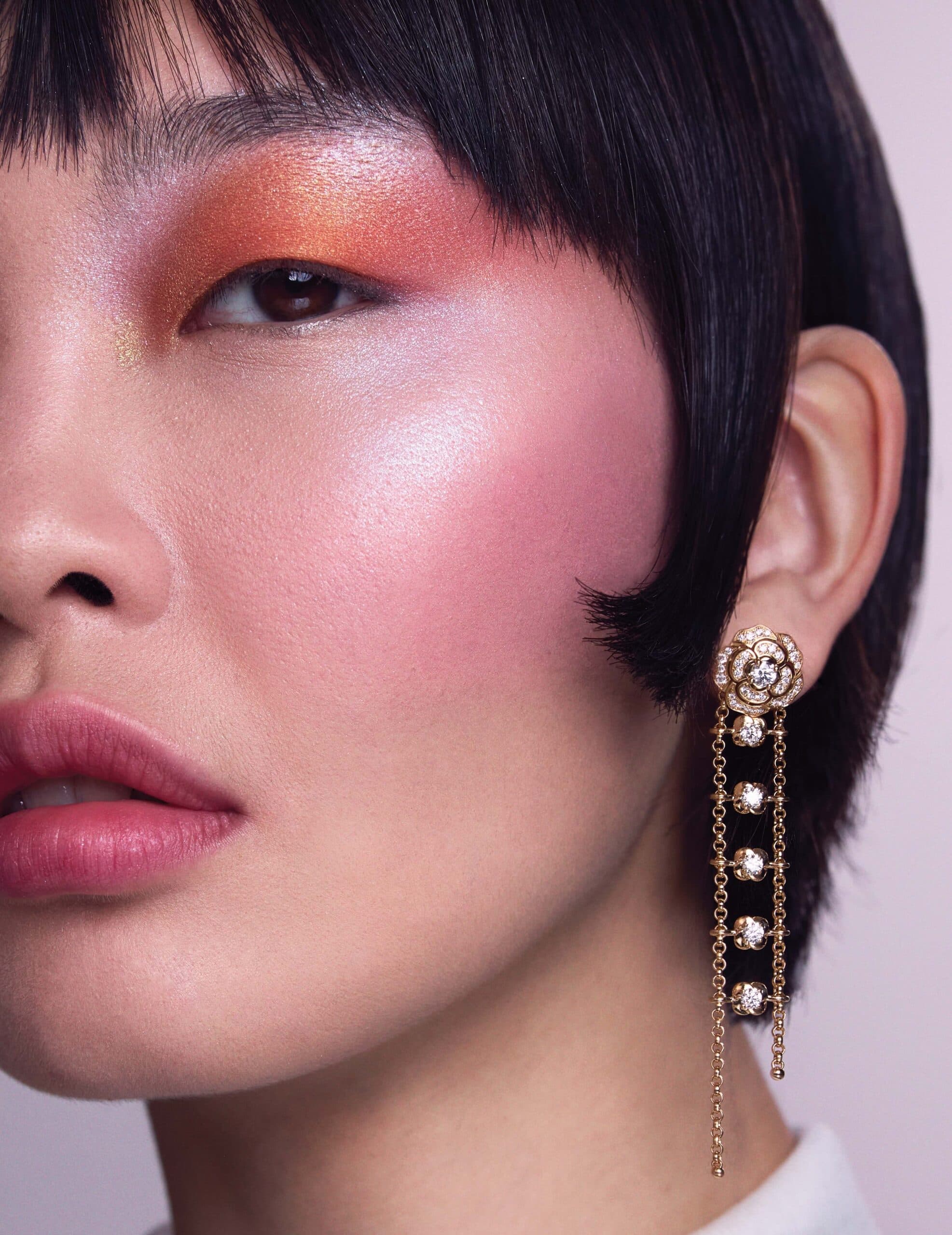 Nomin wears CHANEL Le Lift Crème, CHANEL Les Beiges foundation in BD11 and CHANEL Poudre Universelle Libre in 10 Light on skin, CHANEL Le Gel Sourcils in 350 Transparent on brows, CHANEL Noir Allure mascara in 77 Anthracite on lashes, CHANEL Les 9 Ombres eyeshadow palette in 849 The Space Traveler on eyes, Les Signes de CHANEL Illuminating Powder blush in 997 Rose Lumière on cheeks and CHANEL Rouge Allure Velvet lipstick in 548 Abstrait on lips. Nomin wears Bouton de Camélia supple transformable earrings in 18-carat yellow gold and diamonds by CHANEL Fine Jewellery.