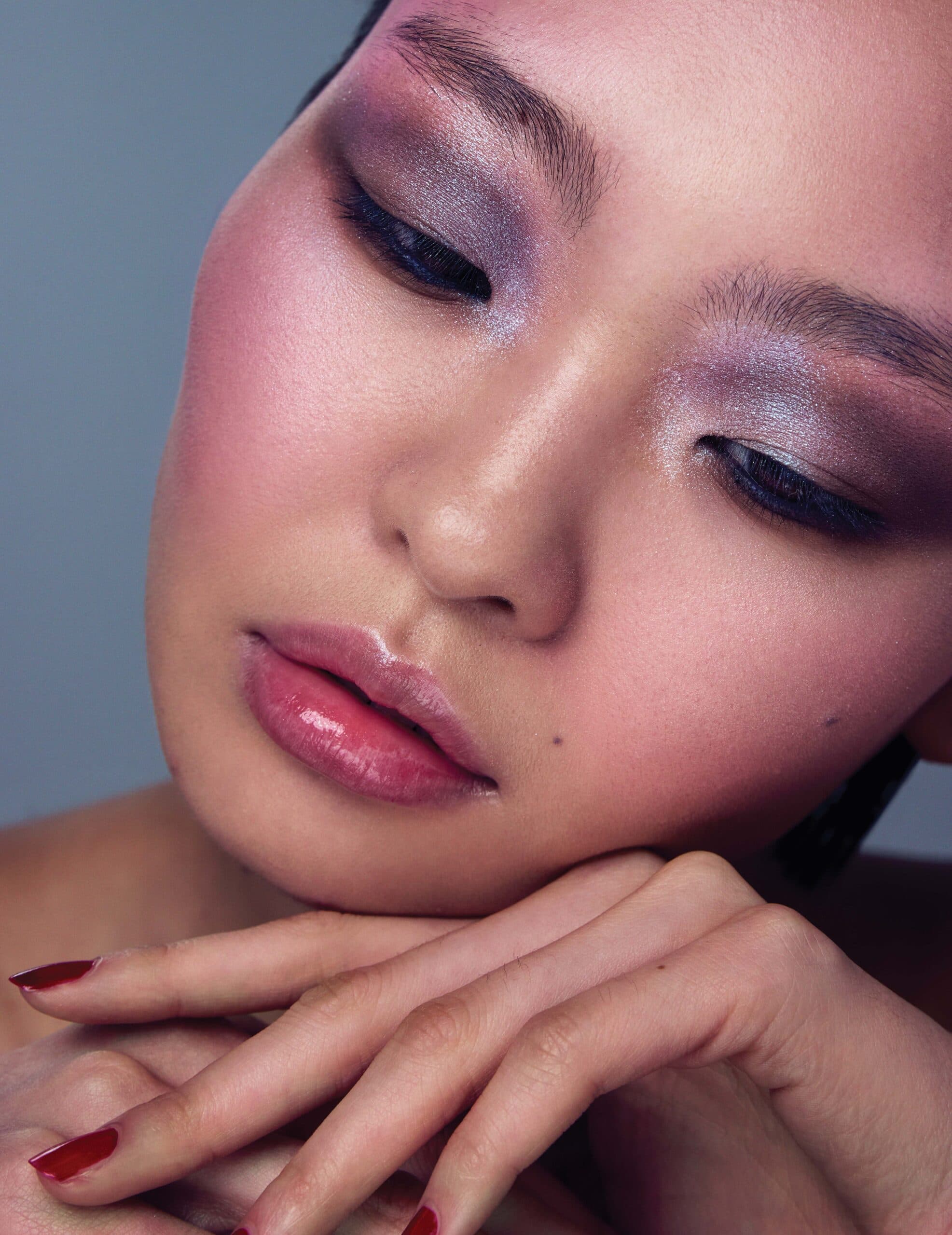 Nomin wears CHANEL Le Lift Crème, CHANEL Les Beiges foundation in BD11 and CHANEL Poudre Universelle Libre in 10 Light on skin, CHANEL Le Gel Sourcils in 350 Transparent on brows, CHANEL Noir Allure mascara in 77 Anthracite on lashes, CHANEL Les 9 Ombres eyeshadow palette in 849 The Space Traveler on eyes, Les Signes de CHANEL Illuminating Powder blush in 998 Pêche Lumière on cheeks, CHANEL Rouge Allure Velvet lipstick in 548 Abstrait and CHANEL Rouge Coco lip gloss in 726 Icing on lips and CHANEL Le Vernis in 369 Alchimiste on nails and CHANEL La Crème Main on hands.