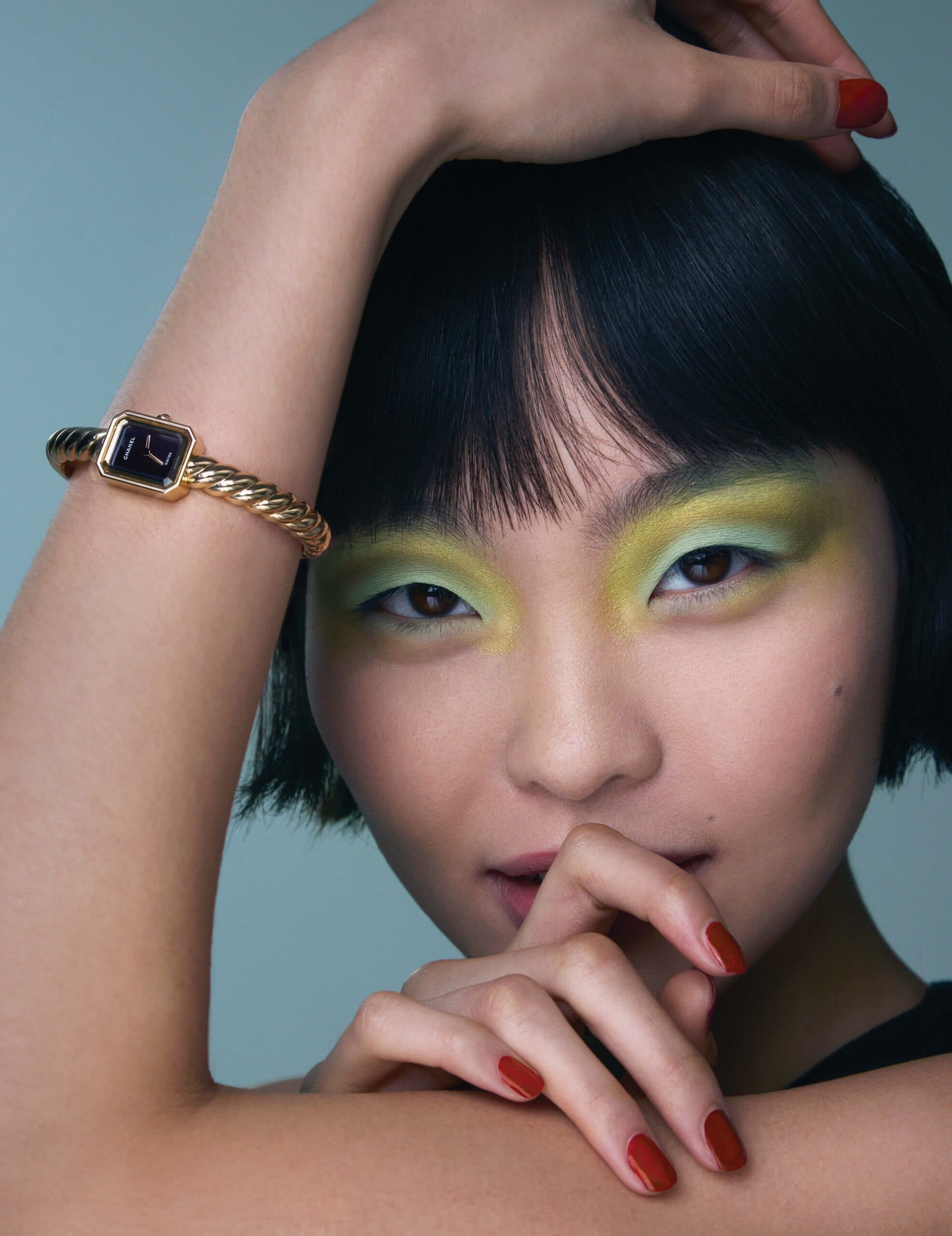Nomin wears CHANEL Le Lift Crème, CHANEL Les Beiges foundation in BD11 and CHANEL Poudre Universelle Libre in 10 Light on skin, CHANEL Le Gel Sourcils in 350 Transparent on brows, CHANEL Noir Allure Mascara in 77 Anthracite on lashes, CHANEL Les 9 Ombres eyeshadow palette in 848 The New Singular on eyes, Les Signes de CHANEL Illuminating Powder blush in 998 Pêche Lumière on cheeks, CHANEL Rouge Allure Velvet lipstick in 548 Abstrait on lips and CHANEL Le Vernis in 369 Alchimiste on nails and CHANEL La Crème Main on hands. Nomin wears Première Galon watch in 18-carat yellow gold and black-lacquered dial by CHANEL Watches.
