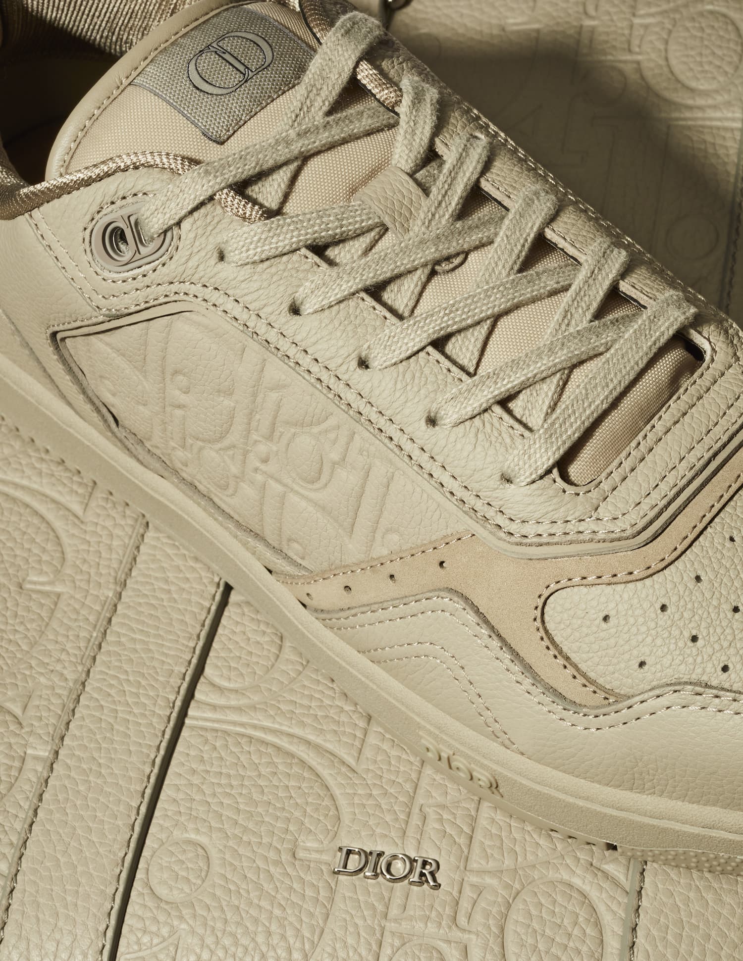 DIOR Men East-West tote bag in beige gravity leather and DIOR Men B27 Low Top trainers in beige gravity leather.