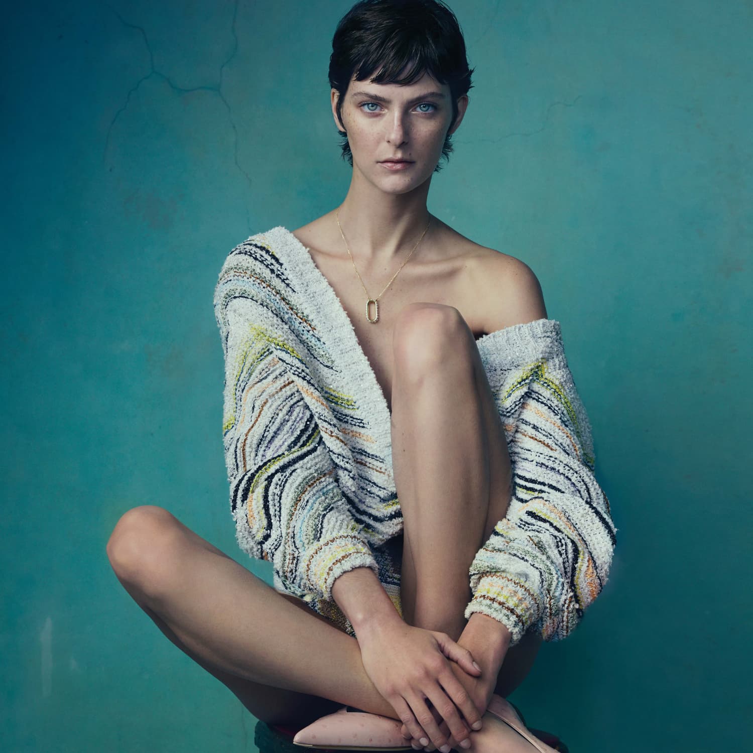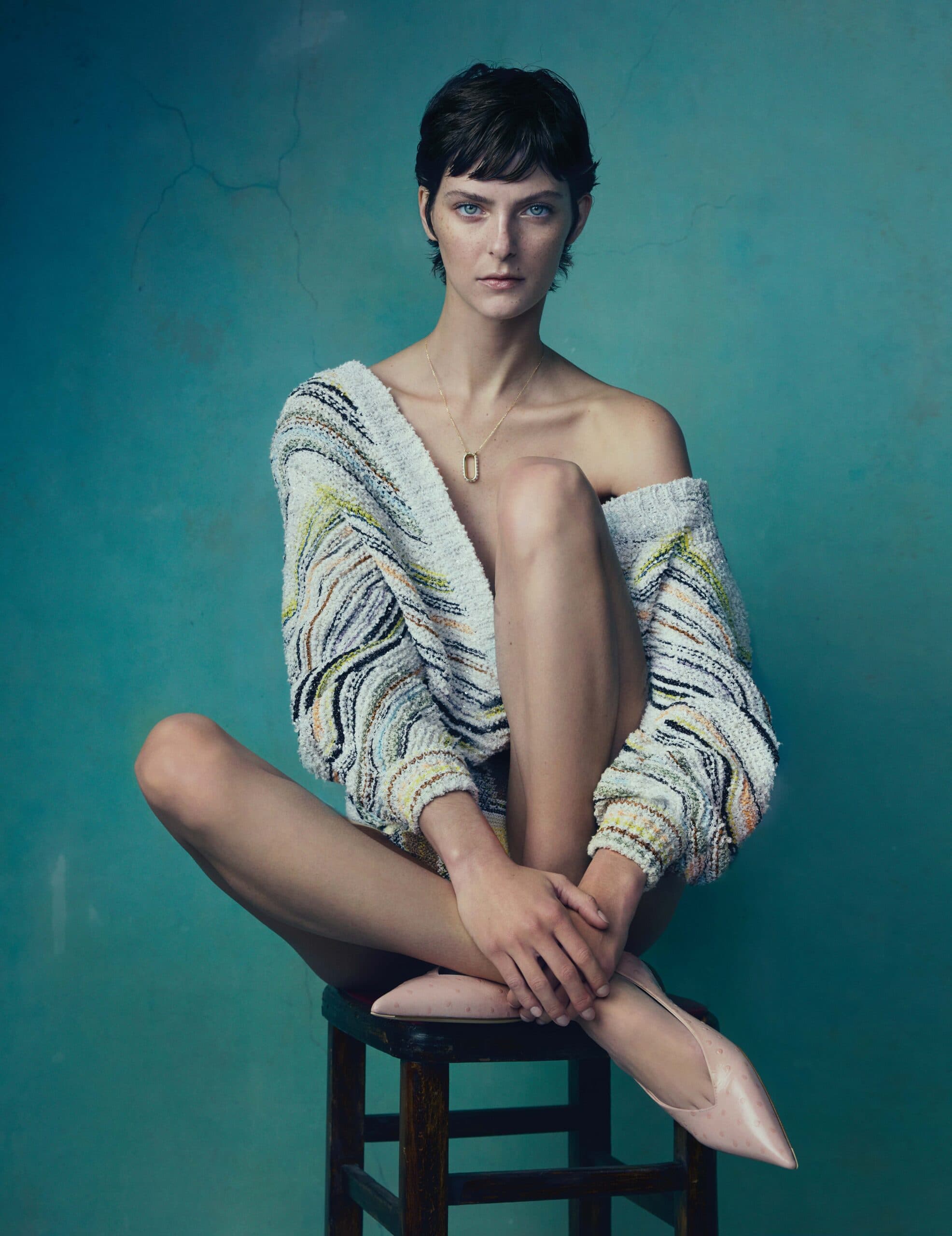 Chloe wears junmper and shorts by MISSONI, shoes by AGL and necklace by MELANIE GEORGACOPOULOS.