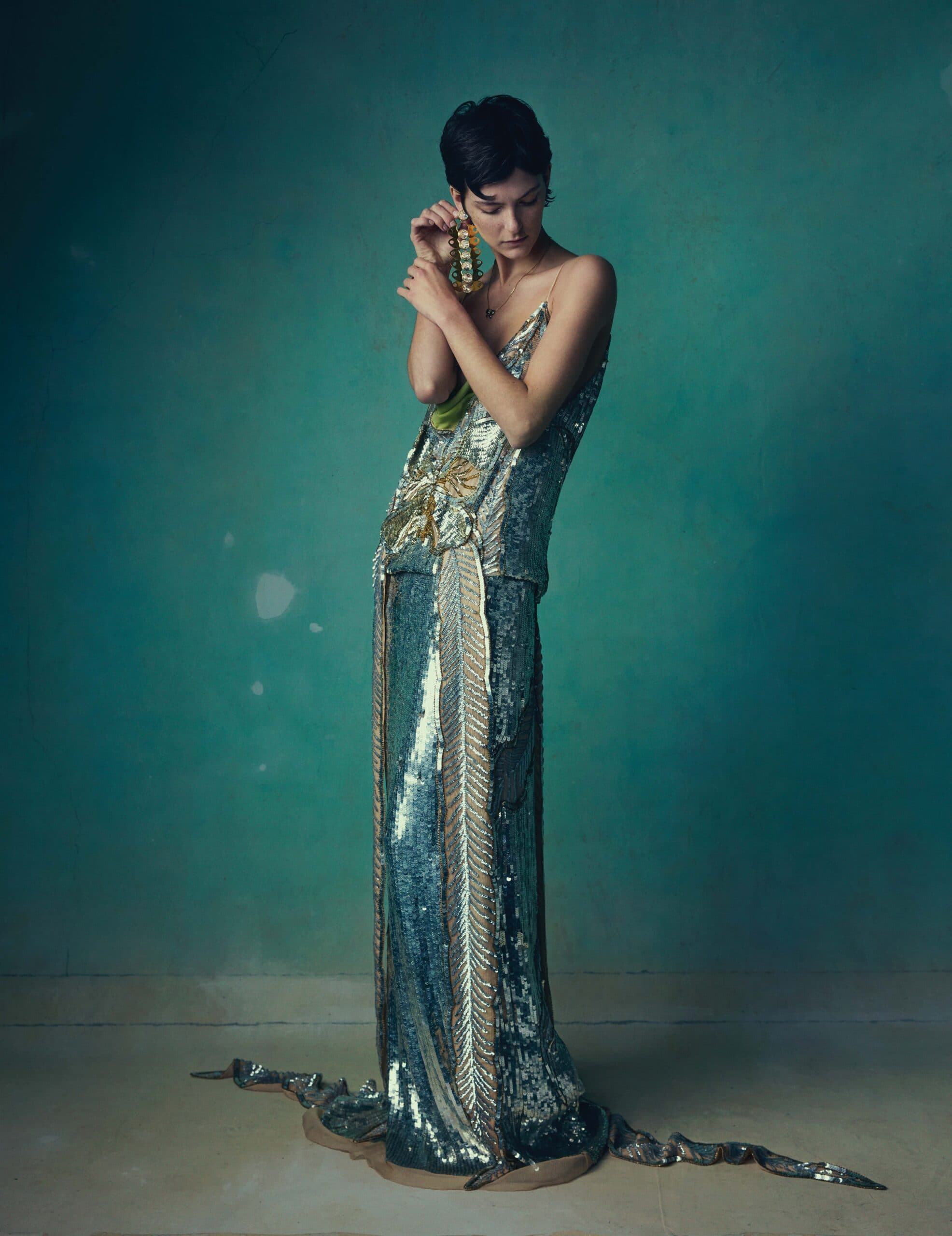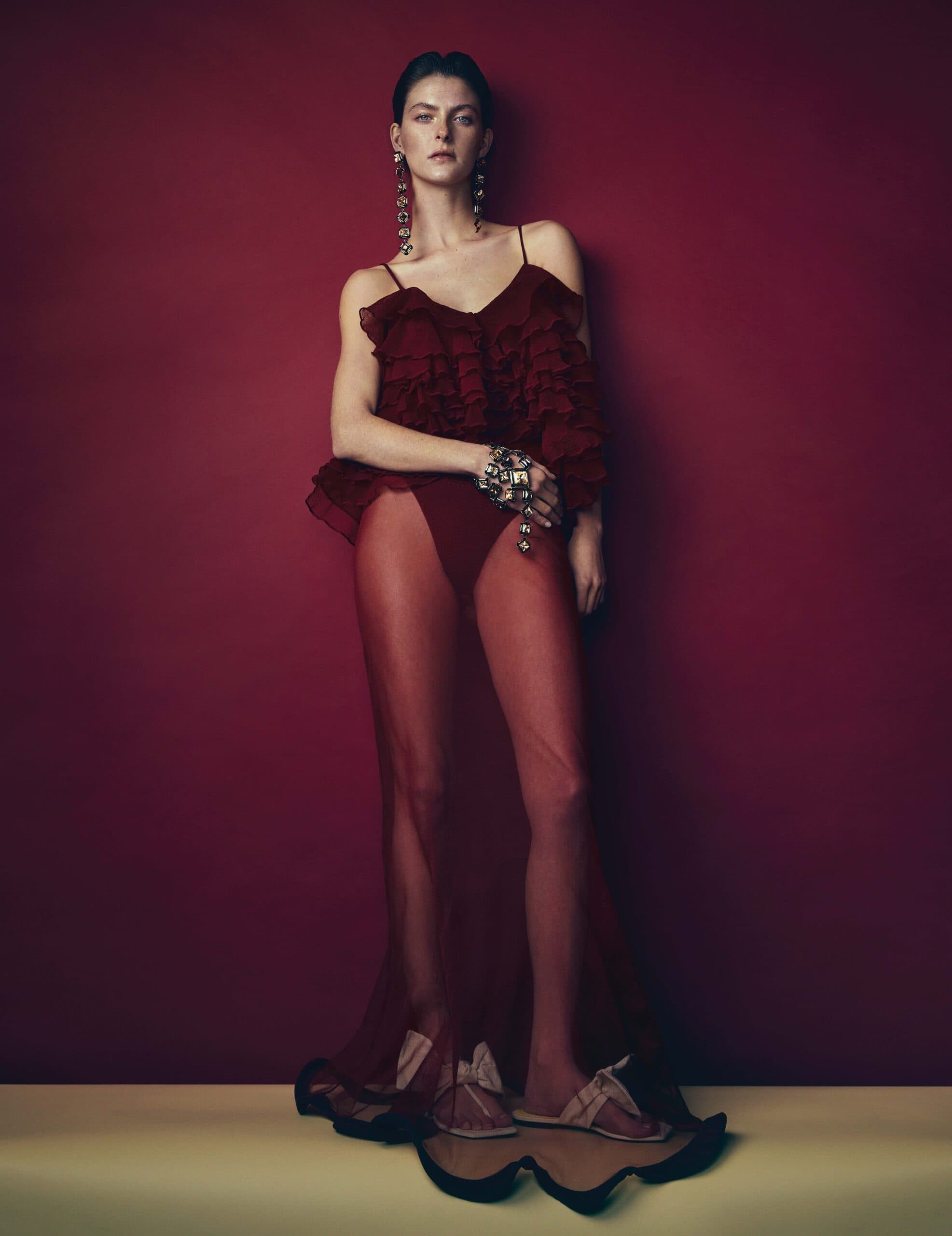 Chloe wears dress, necklace and earrings by VALENTINO.