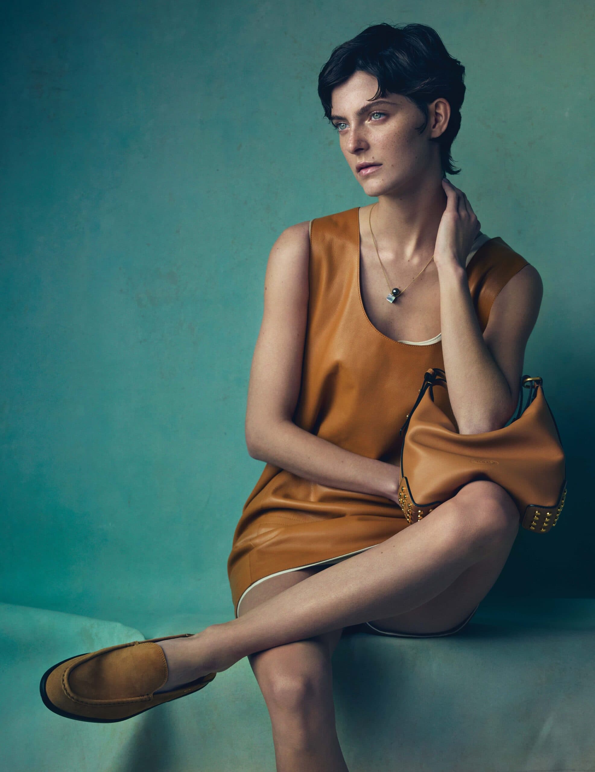 Chloe wears dress, shoes and bag by TOD’S and necklace by MELANIE GEORGACOPOULOS.