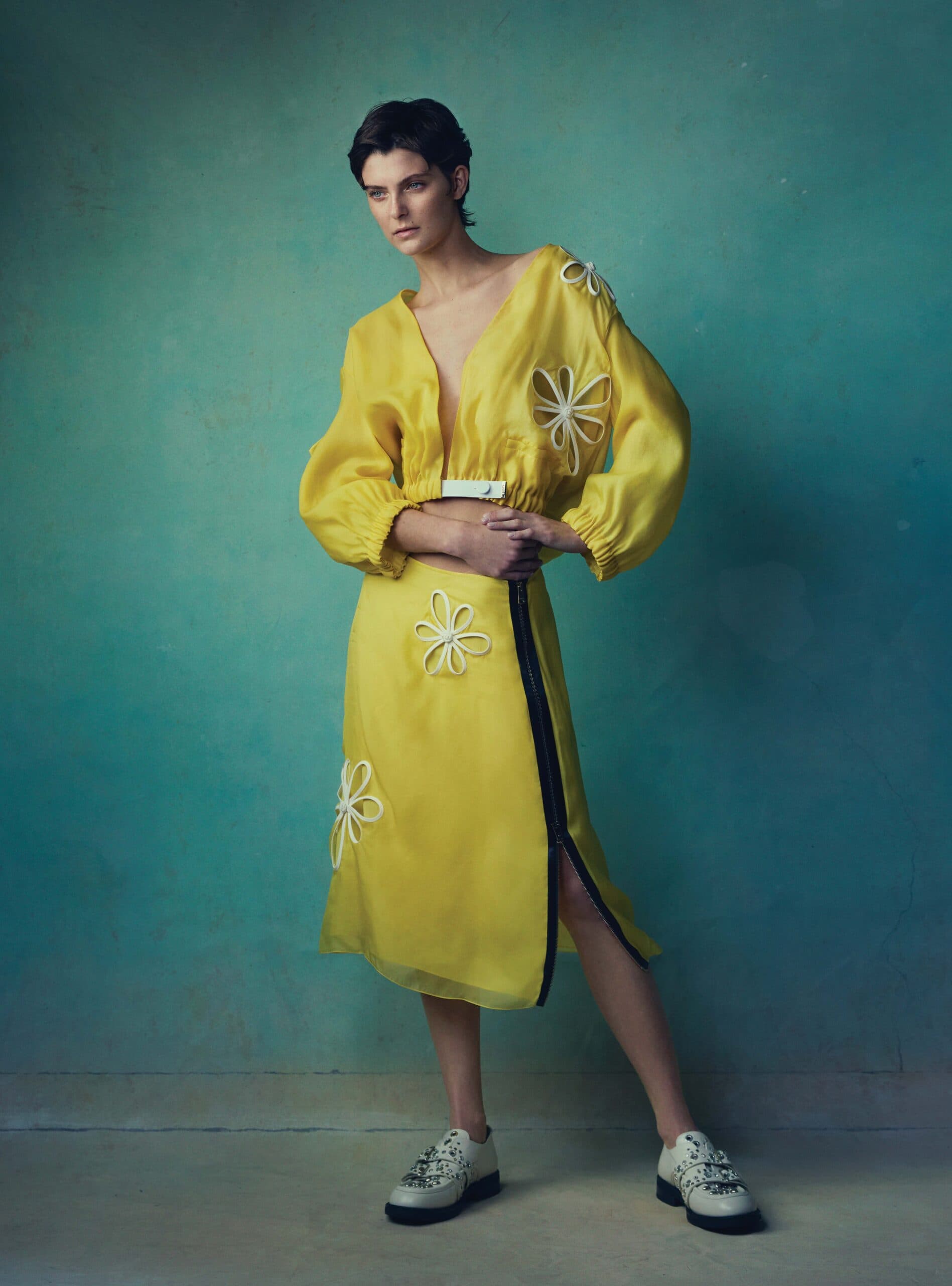 Chloe wears top and skirt by FENDI and shoes by N021.