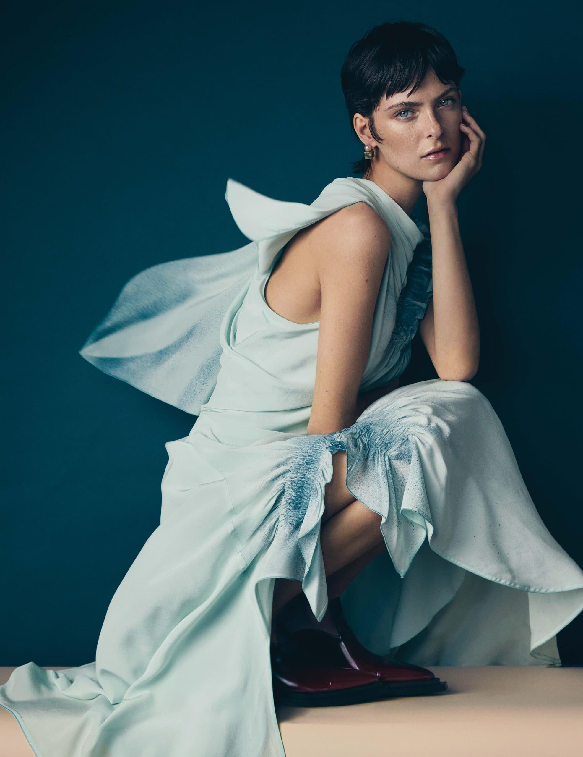 Chloe wears dress and shoes by VICTORIA BECKHAM and earrings by MELANIE GEORGACOPOULOS.