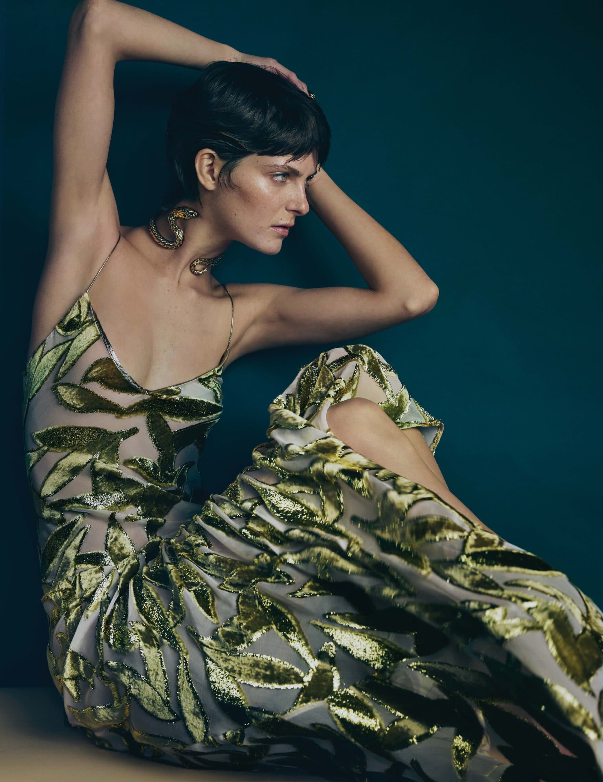 Chloe wears dress, necklace and ring by ROBERTO CAVALLI.