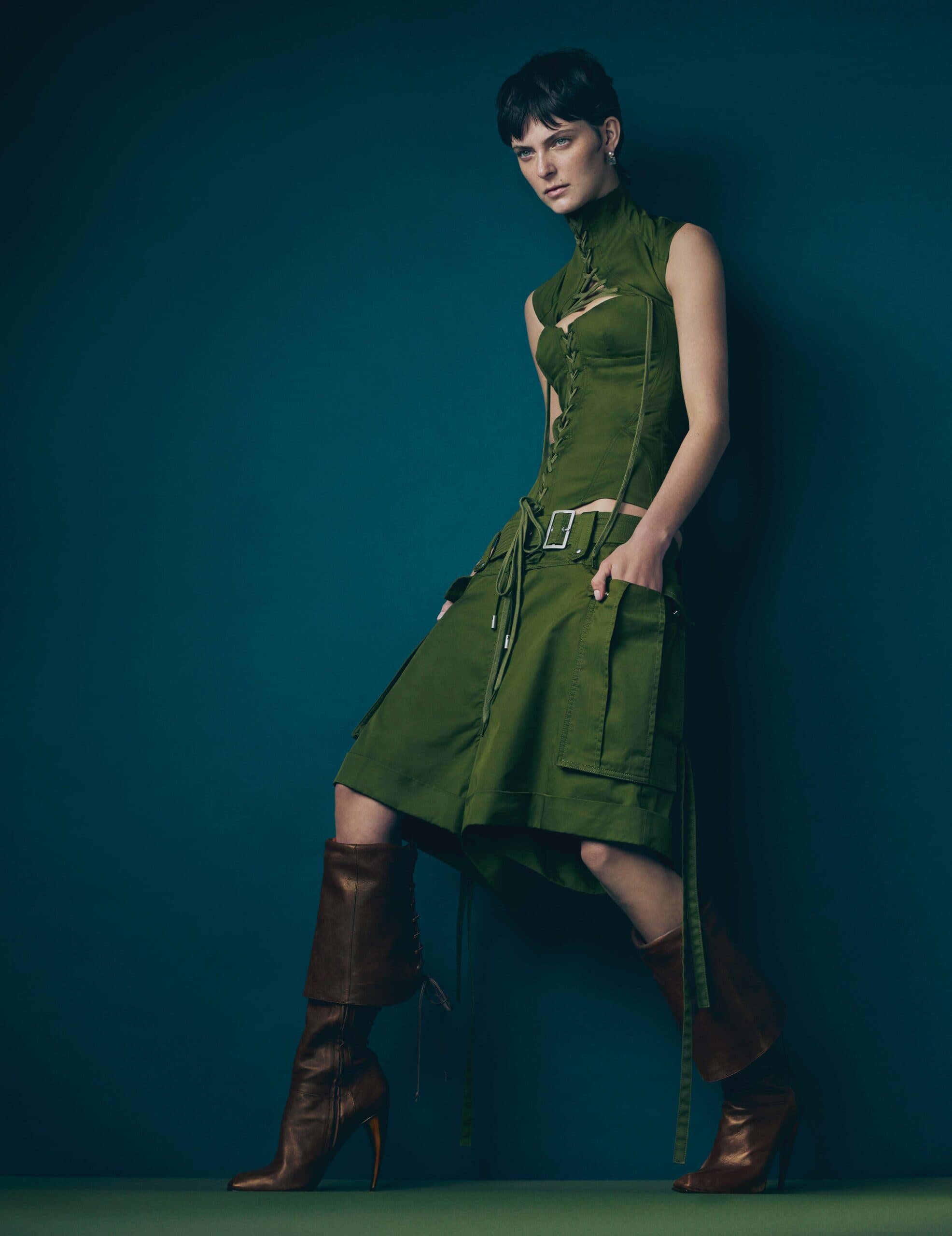 Chloe wears top, shorts and boots by MCQUEEN and earrings by MELANIE GEORGACOPOULOS.