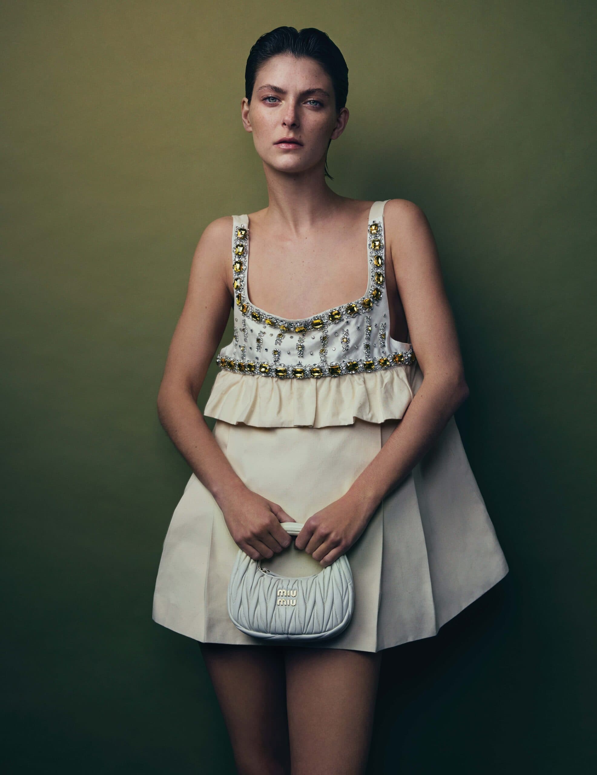 Chloe wears dress and bag by MIU MIU.