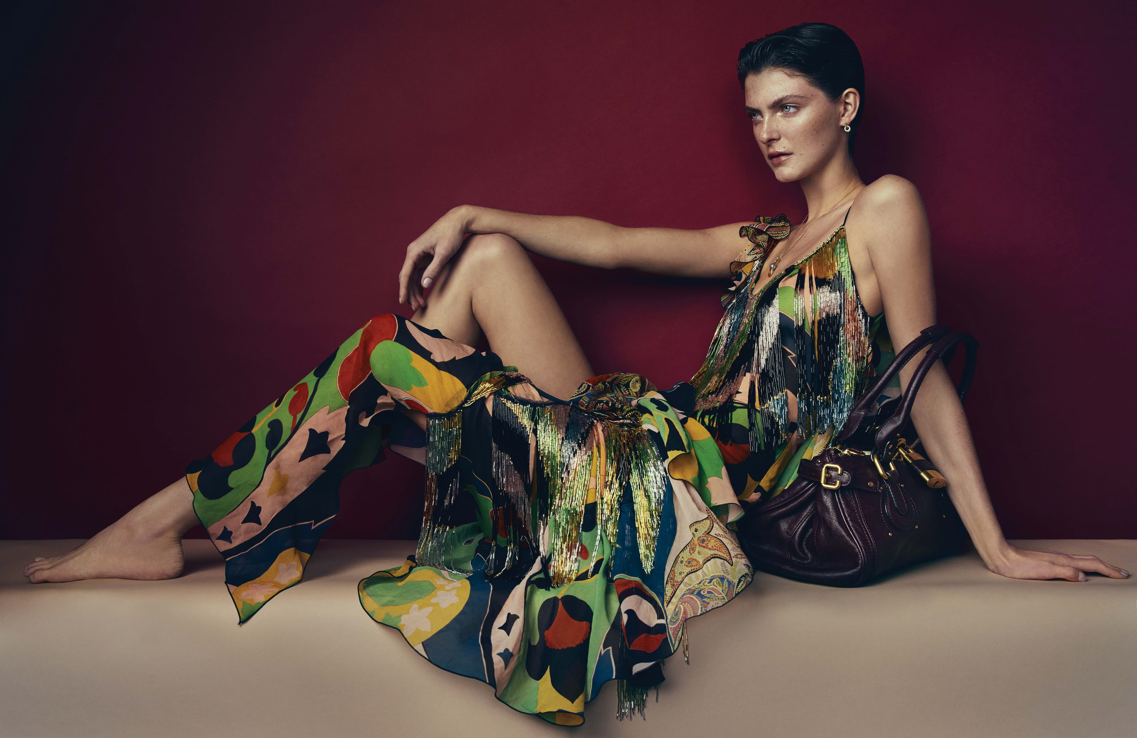 Chloe wears dress by ETRO, bag by CHLOÉ and earrings and necklace by MELANIE GEORGACOPOULOS.
