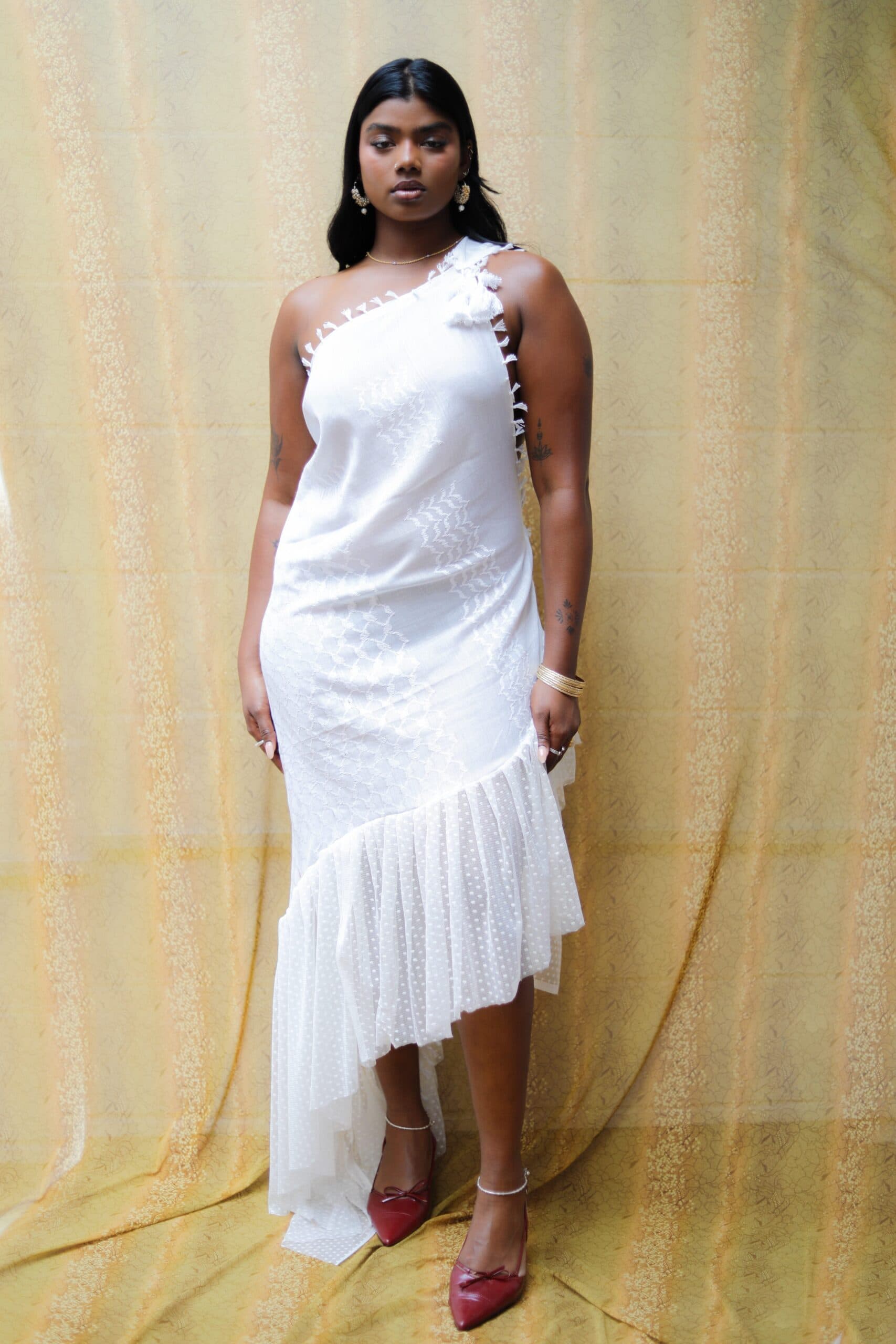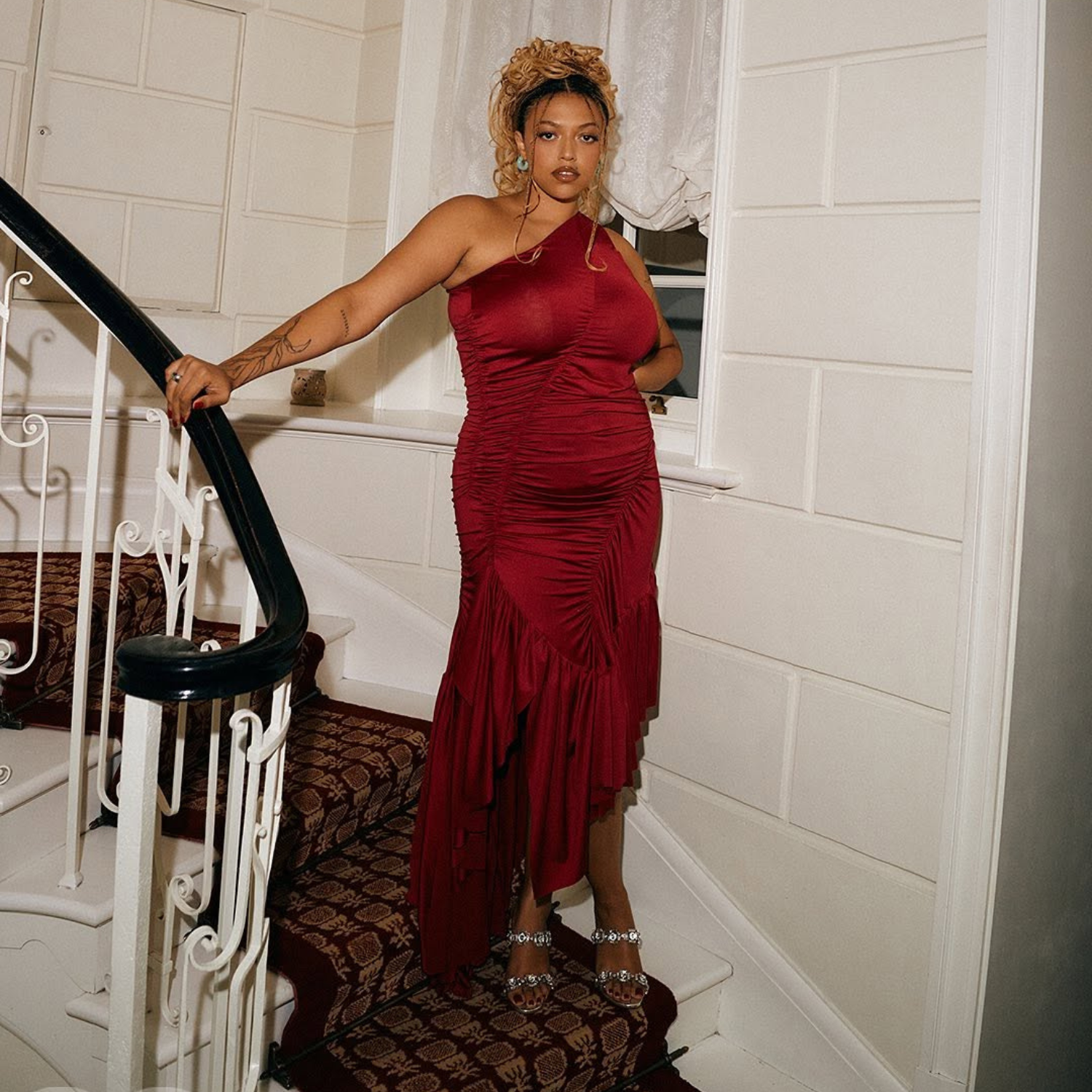 Going against the grain of mainstream fashion, in not one but two ways, was inevitably daunting — but a viral success gave Hussain some well-earned confidence. It came in the form of a custom piece she created for ‘Be Honest’ singer Jorja Smith in 2023. The look, an asymmetrical draped steely grey dress, went viral online and consequently propelled the brand forwards. “I was really proud of that moment,” Hussain says. “It gave me a big boost of confidence.” Since then, she’s dressed artists Raveena Aurora and Mahalia, and most recently, DJ Nooriyah for her show at the Jazz Cafe Festival in August, where she donned a red keffiyah dress, a fierce union of political and cultural identity. For the twenty-seven-year-old, the two things are inseparable. “Fashion has always been political,” she affirms. “It’s a way for me to express where I stand and how I feel about certain topics around the world or at home here in the UK.”