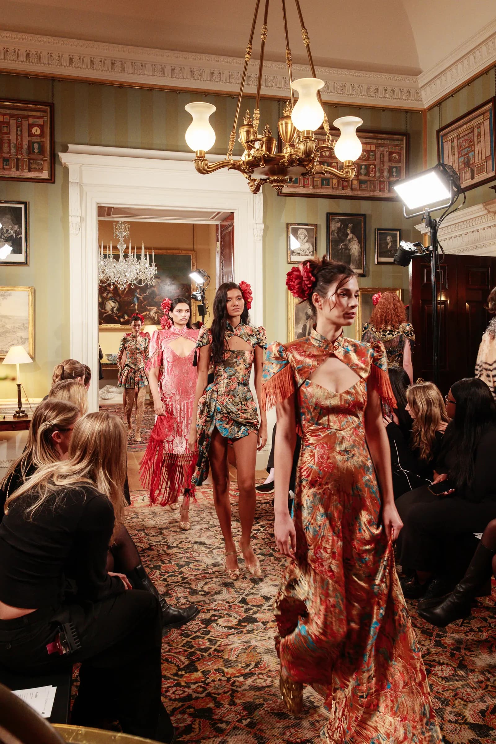 Previously recognised as Annie’s Ibizia, the Autumn/Winter 2026 season marked a pivotal transition for the fashion label, as it unveiled its latest collection, Return to Self, under a newly refined name: Annies. With the new name came a distinct creative shift. It marked the first time Annie Doble peppered the runway with shoes and tailored trousers alongside their signature heirloom-inspired pieces, elevated by gleaming jacquards and lavishly embellished sheer dresses. Taking to Spencer House, models paraded down the runway as unapologetically loud as ever. Hues of fuchsia and oxblood intertwined with saffron, gold and copper adornments, while midnight blue, teal and deep navy tones were woven seamlessly through lamé. Echoes of Annie’s Ibiza home nestled in Dalt Vila were present throughout. Think: hydrangeas and floral prints. However, fresh sources of inspiration — from nineteenth-century Venetian wallpaper to early twentieth-century vases — were intricately infused into the delicate embroidery and playful tasselled details of the dresses. These details extended to the footwear, where delicate hand-stitched threads traced the straps and embroidered glass beadwork lent a jewelled finish. In an era where the naked dress reigns supreme, Annie’s delivered a masterful interpretation. Crafted from champagne-hued threads, the sheer maxi featured intricate lace embroidery, while a feather boa was draped around the neck. A bold red flower tucked into the model’s hair added a note of romance — a warm-weather flourish that paid homage to where it all began for the brand.
