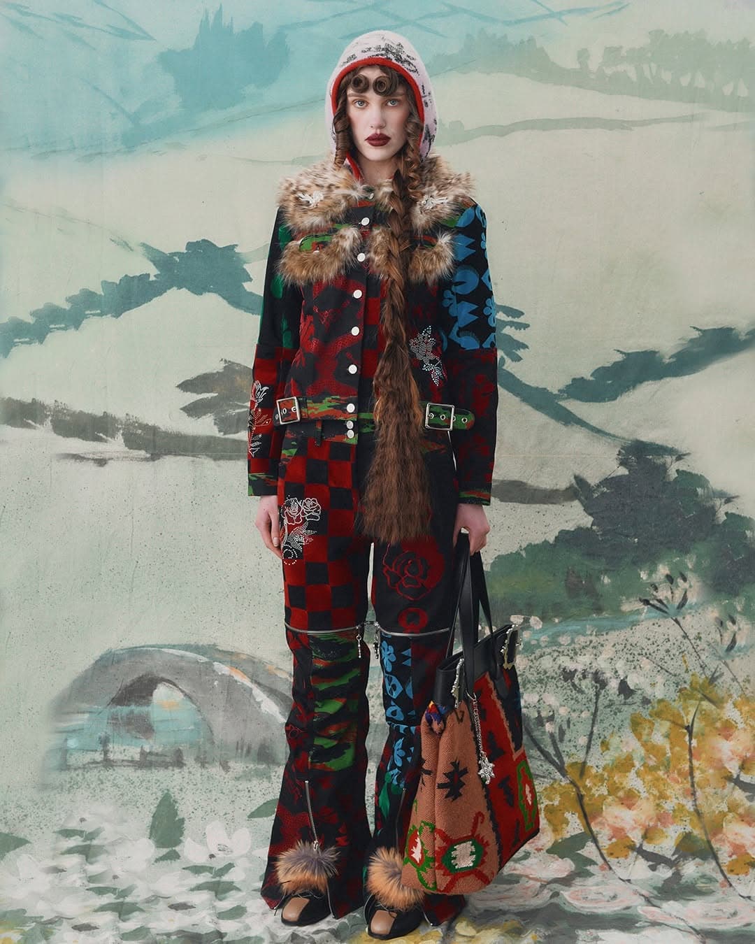 Chopova Lowena unveiled its AW26 collection within the fittingly historic nineteenth-century Crafts Council building. While the brand has long been championed for its upcycled folkloric textiles, playful prints and signature carabiner skirts, it was Regency-era silhouettes fused with Argyle knits and kilts that defined the Too Ripe and Ready by Half collection. Islington was transported to a bygone era, where mannequins were dressed in basque-waist corset gowns made from rich upholstery textiles. The pieces featured whimsical beaded bows cascading down the bodice, flowing into puffed skirts layered with fabric and finished with a delicate overlay of blue tulle. Deadstock fabrics from previous collections were combined with plaids, florals and knits, all adorning bubble-sleeve dresses with crisp, preppy collars. Menswear followed a similar path, pairing striped rugby tops embellished with silver brooches and layered under bomber jackets. The presentation also introduced the brand’s new intimates line. But in true Chopova Lowena fashion, the tees, bras and knickers were anything but ordinary. Each piece appeared in bold hues, adorned with miniature poems and artistic prints that made them wearable statements in themselves.