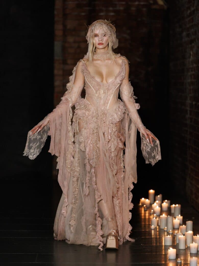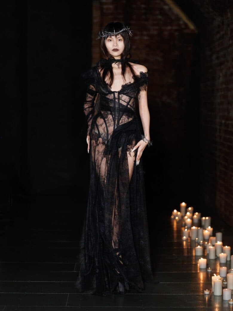 For AW26, Dreaming Eli founder Elisa Trombatore brought her most personal collection yet to the runway. The show, titled The Court of the Maddest, Merriest Things Alive, pays homage to Trombatore and her longtime friend and collaborator, art director Arian De Vos. The collection’s central thesis, “love outside of love”, is a meditation on female friendship as “the glue of life”. Rather than marking it as the antithesis of romantic love, however, the collection draws on Trombatore and De Vos’s shared obsession with creepiness, raw beauty and sexual freedom — themes that are romanticised on the runway. Initially, there’s a gentle colour palette of nudes, pinks and creams, paired with delicate laces and ribbons. Yet, the collection thrives in contrast, and is sharpened right back up again with black, distressed, sometimes burnt materials, set off by barbed jewellery and headpieces. As for the title of the show: each look embodies a distinct character within a reimagined court setting. It is a place where principles are governed not by hierarchy, but by female alliance and the unexpectedly unifying factor of dichotomy. From gothic, black-lace gowns to bustiers adorned with pearls and pleated silks, Dreaming Eli’s AW26 collection is for every woman, from the Marie Antoinettes to the Maleficents of the world. It evokes the beauty of difference, and the magic of women uniting, not despite it, but through it.