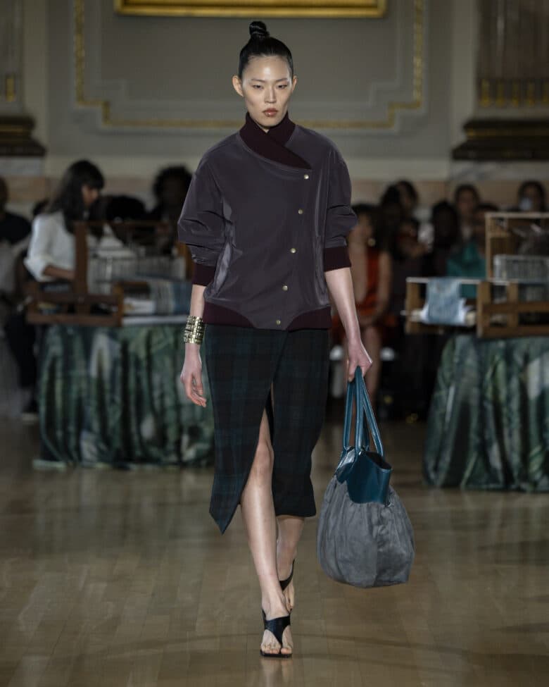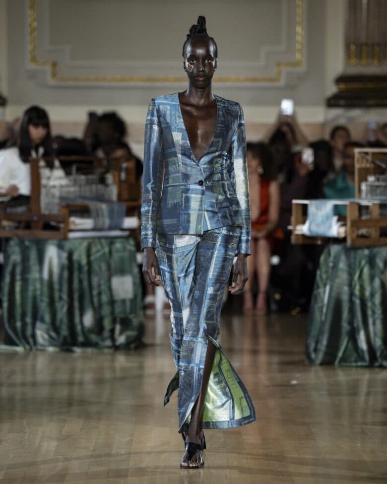 Behind every garment lies a story that begins with the very threads that created it. And for Labrum London’s creative director, Foday Dumbuya, that’s a story worth telling. Upon arrival at his show, which was staged in London’s Great Hall, guests were greeted by two handlooms where weavers skillfully interlaced yarn. Then came the show’s opening poem, narrated by Yomi Sode, that told a story about culture and the migration of textiles. It’s a story that resonates with Dumbuya himself, whose life journey, which traces back from Sierra Leone to Cyprus and London, lives inside this work. This was a testimony that was hard to miss on the runway, where craft took form in elongated coats with funnel collars, embroidered suits, Chinese silks and sarong skirts in the brand’s reimagined signature passport fabric: a textile laser etched into Japanese indigo denim. But the cultural references did not end with the clothes. Dumbuya paired looks with crocheted bags that celebrated Sierra Leonean raffia craft, hand-shaped brass sculptural earrings in collaboration with bespoke designer Florence West and a cowrie shell crochet grid worn as a headpiece. This was a collection for the diaspora. A true visual banquet of culture travelling through clothes.