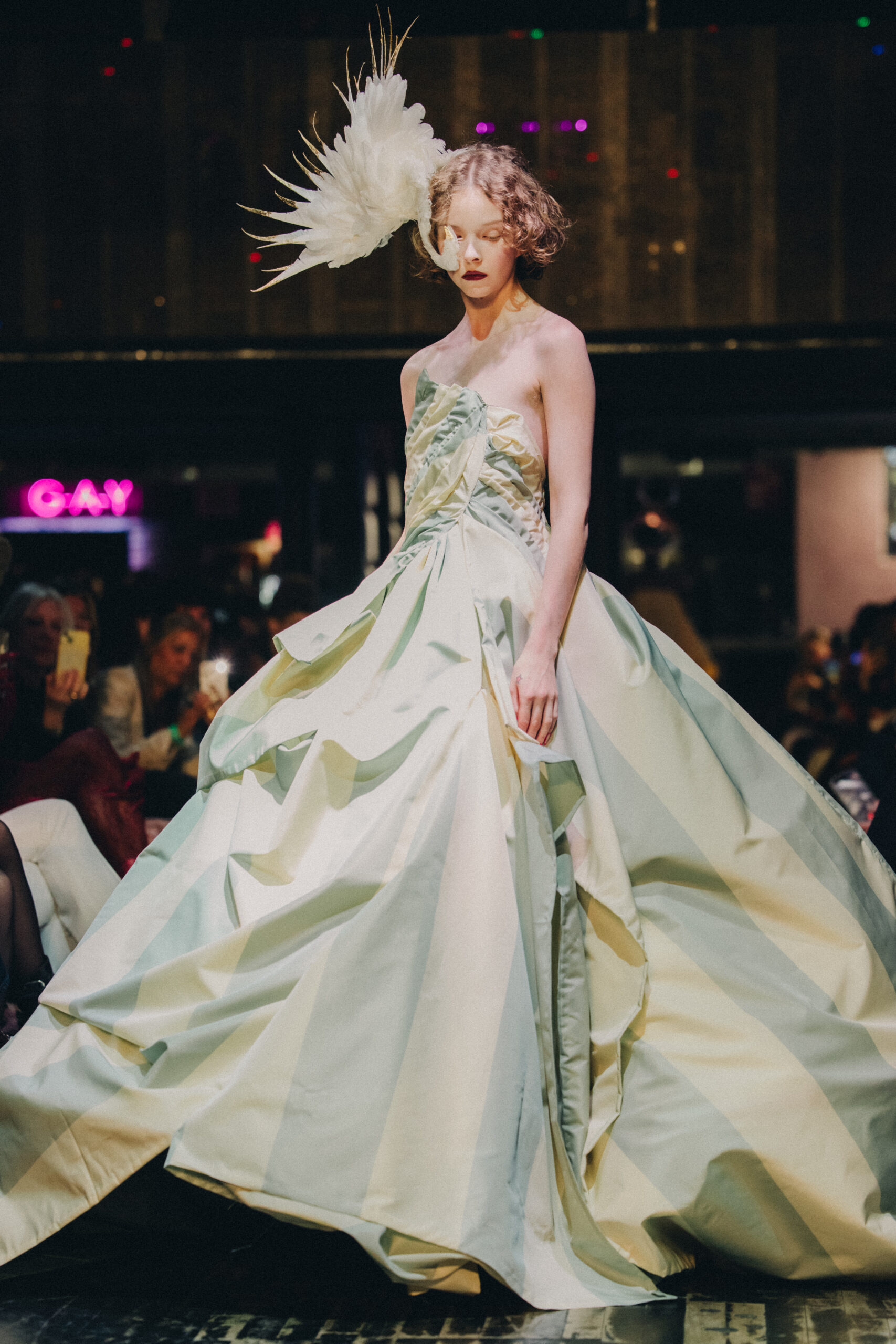 For his AW26 collection, Hector Maclean took inspiration from his grandmother, Leokadia Osko. Escape chronicles the resilience and loss faced by Osko, who was displaced from Poland during WWII, but the presentation was anything but solemn. Taking place in London’s campest and most celebratory venue, Heaven nightclub, models playfully bit the glass fruit they carried (a homage to the fruit stall where Maclean’s grandfather would visit Osko in the refugee camp they were placed in), as a club remix of ‘War’ by Edwin Starr rounded up the catwalk. As for the clothes themselves, the influence of the designer’s history working with Vivienne Westwood was present in the experimental use of drapery and merging of soft materials with tailored fabrics. The influence of Maclean’s grandmother was also felt throughout the collection’s materiality and silhouettes, including a dress made of doilies and tailored military jackets.