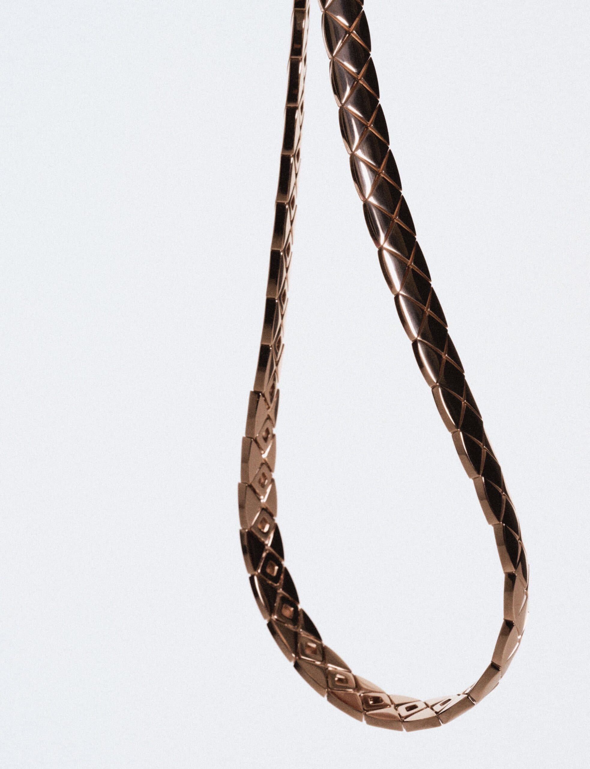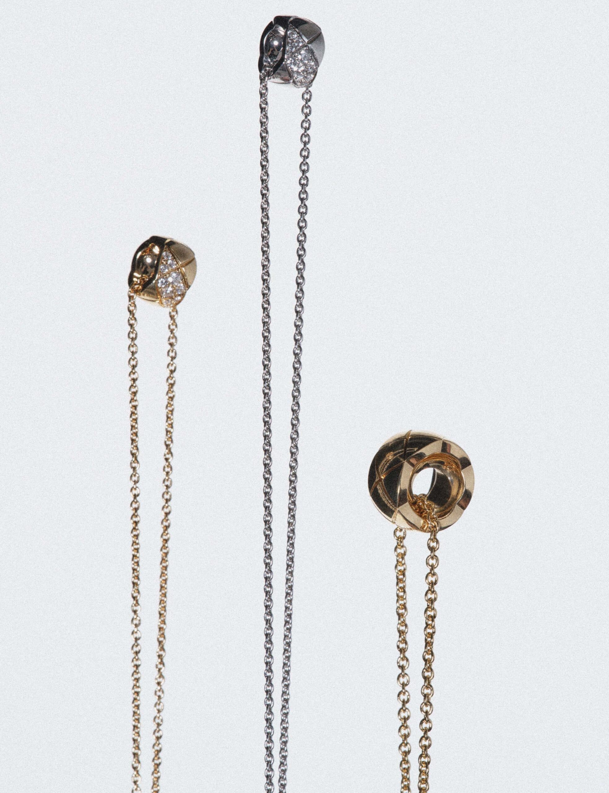 Coco Crush necklace, quilted motif, small version, 18K beige gold and diamonds, Coco Crush necklace, quilted motif, small version, 18K white gold and diamonds and Coco Crush necklace, quilted motif, large version, 18K beige gold All by CHANEL Fine Jewellery.