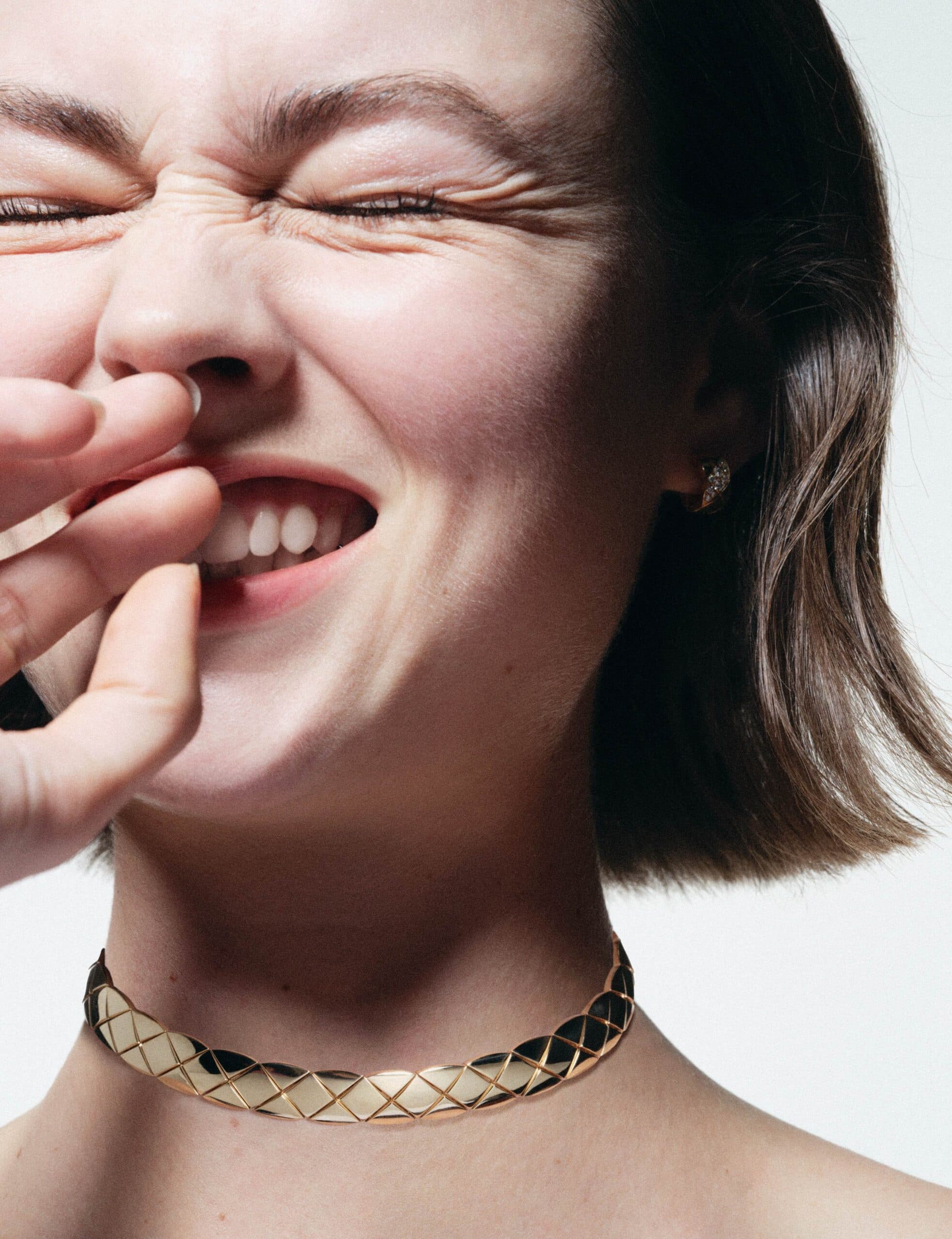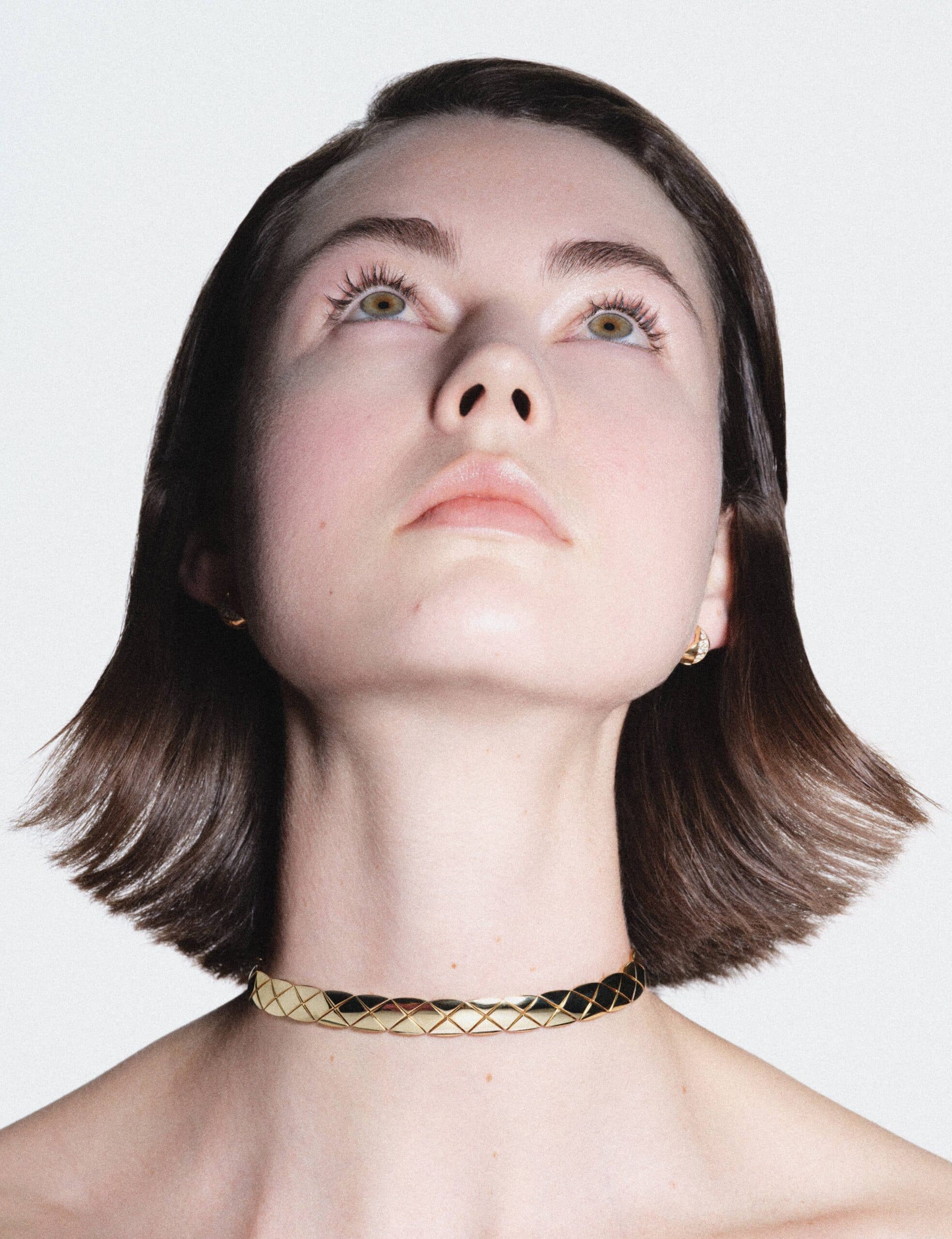 Coco Crush supple choker, quilted motif and 18K yellow gold and Coco Crush earrings, quilted motif, 18K white gold All by CHANEL Fine Jewellery.