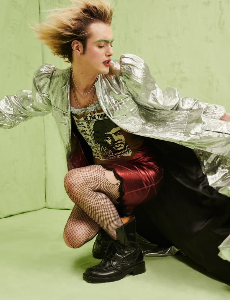 Beyond being a role model to other trans men in the fashion world, McArthur is also flying the flag for kinder, more fluid expressions of masculinity. While male models can often be stereotyped as brooding and solemn, McArthur is an unabashed delight and unafraid to goof off online (his Instagram handle is @casil_the_goat_lord) or publicly explore his love of cosplay, anime and pretty dresses. “There are so many ways to be a man, no right or wrong way, just be a good person,” he says. “Encourage yourself to find who you are.”