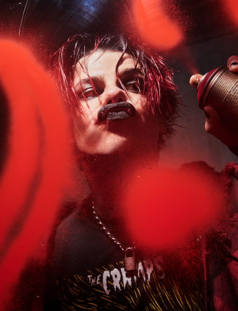 I think the clothes you wear say what you want to say without having to open your mouth, and fashion has always been so important to me. I have a bit of a problem with fashion at the minute. For me, mainstream fashion doesn’t have a lot of heart, it’s like; “Top 10 artist works with top 10 designer.” Then they work with the [magazine] editors and they’re all in bed together. It all feels so fucking corporate. What I miss about fashion is that it’s all supposed to be sick and twisted and new, and it feels like right now all the subcultures are exploited. Art never dies, it’s out there right now, but a lot of big wigs in fashion don’t want to let it shine. Let it shine! With clothes I don’t know what’s fucking cool, I just work with my best friends and I wear what I want – like my girlfriend makes my fucking skirts. I lead with my heart and that’s what I’ve always done.