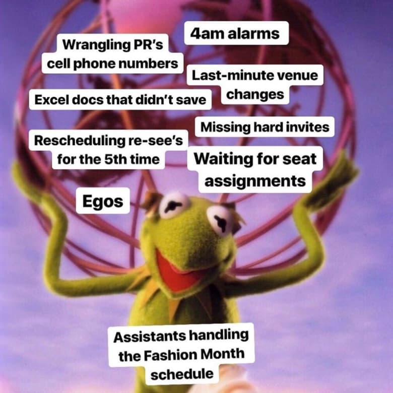 The best part of making memes is making people laugh. I don’t do it for any other reason. I’m glad it resonates with so many people from industry veterans to interns or even followers who don’t work in the industry. People get so riled up this time of year and it’s been fun to call out certain things no one else would and put a little green frog behind it. It gives it all a bit of relief and breathing room. If this business can’t be fun, what the hell are we doing here?