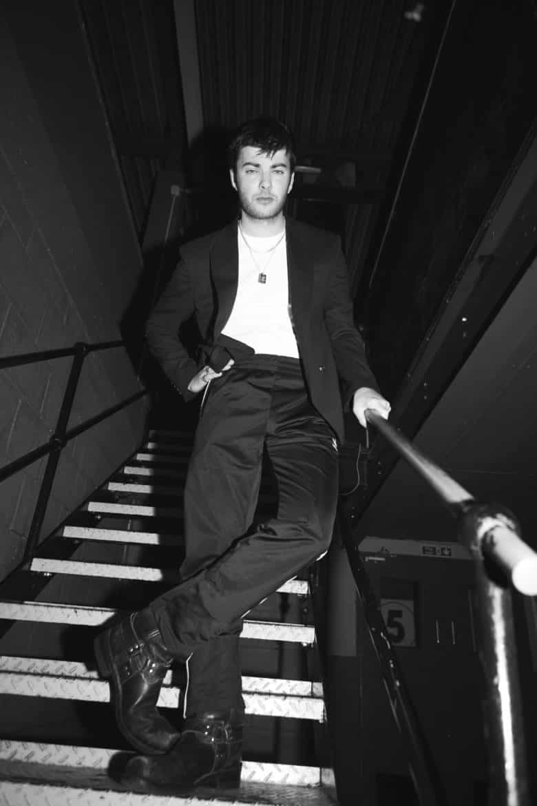 Conor Deegan III wears shirt and blazer by SAMSØE SAMSØE, trousers by HELEN ANTHONY and their own shoes. Tom wears stylist’s own vest.