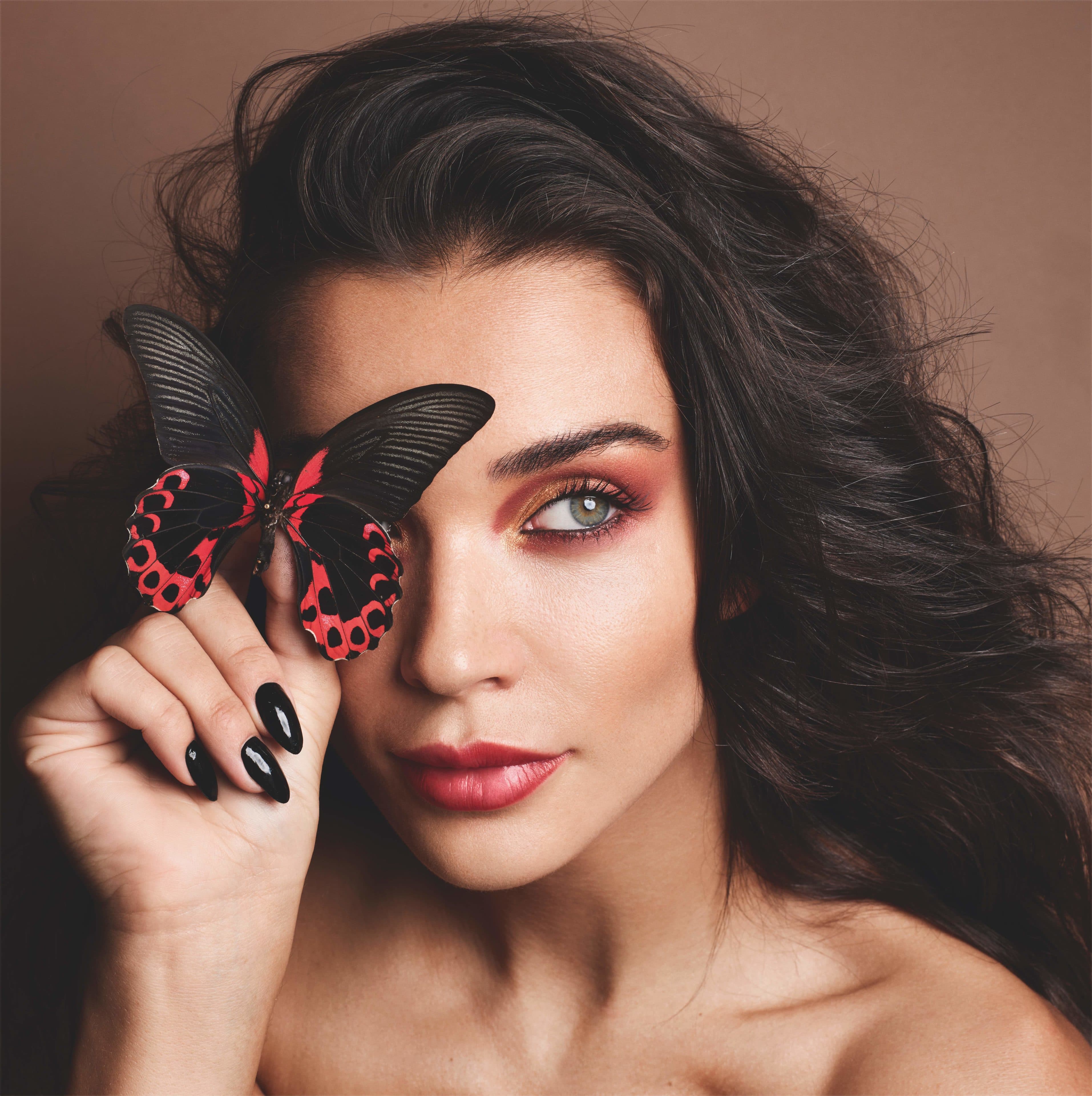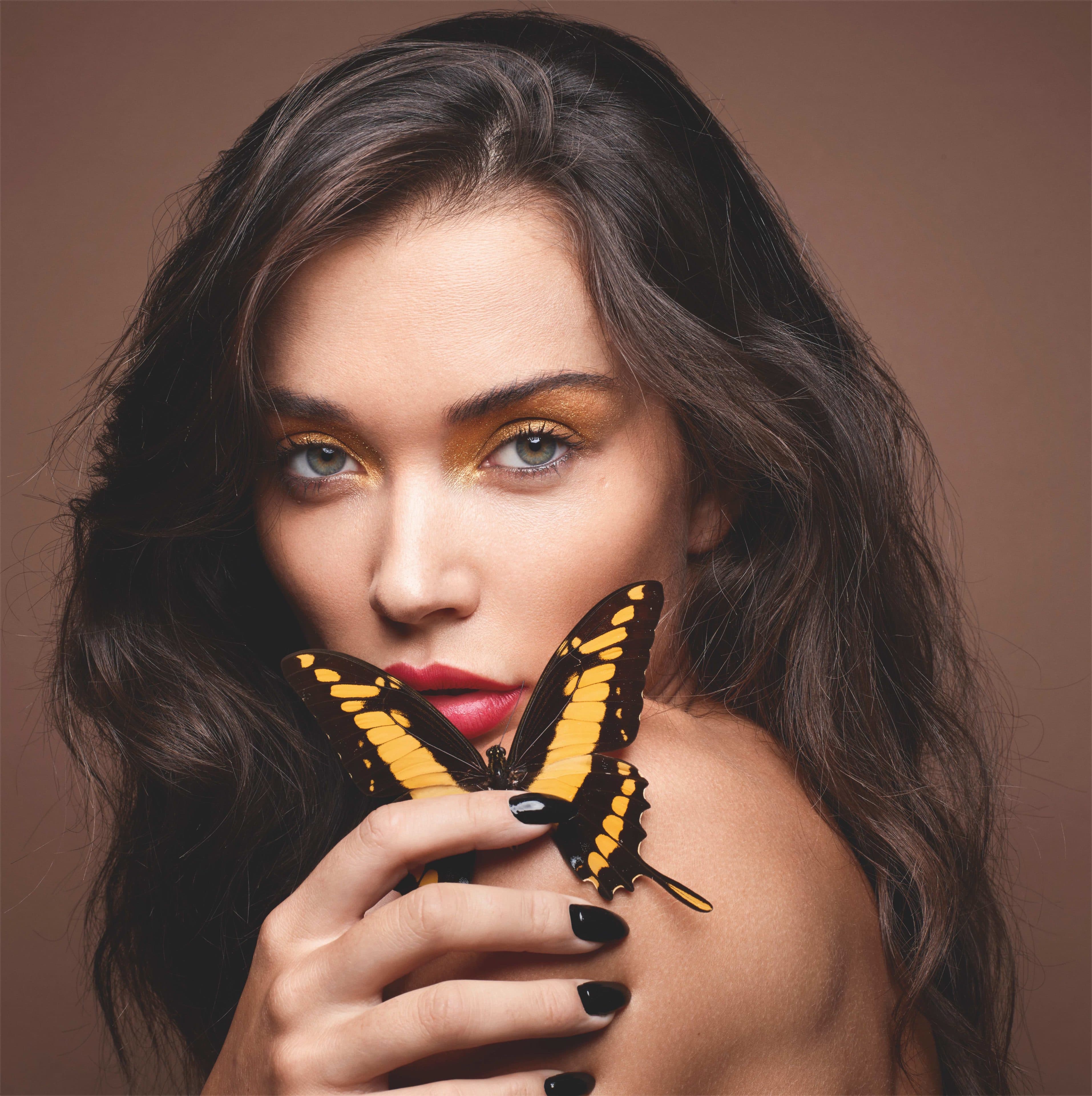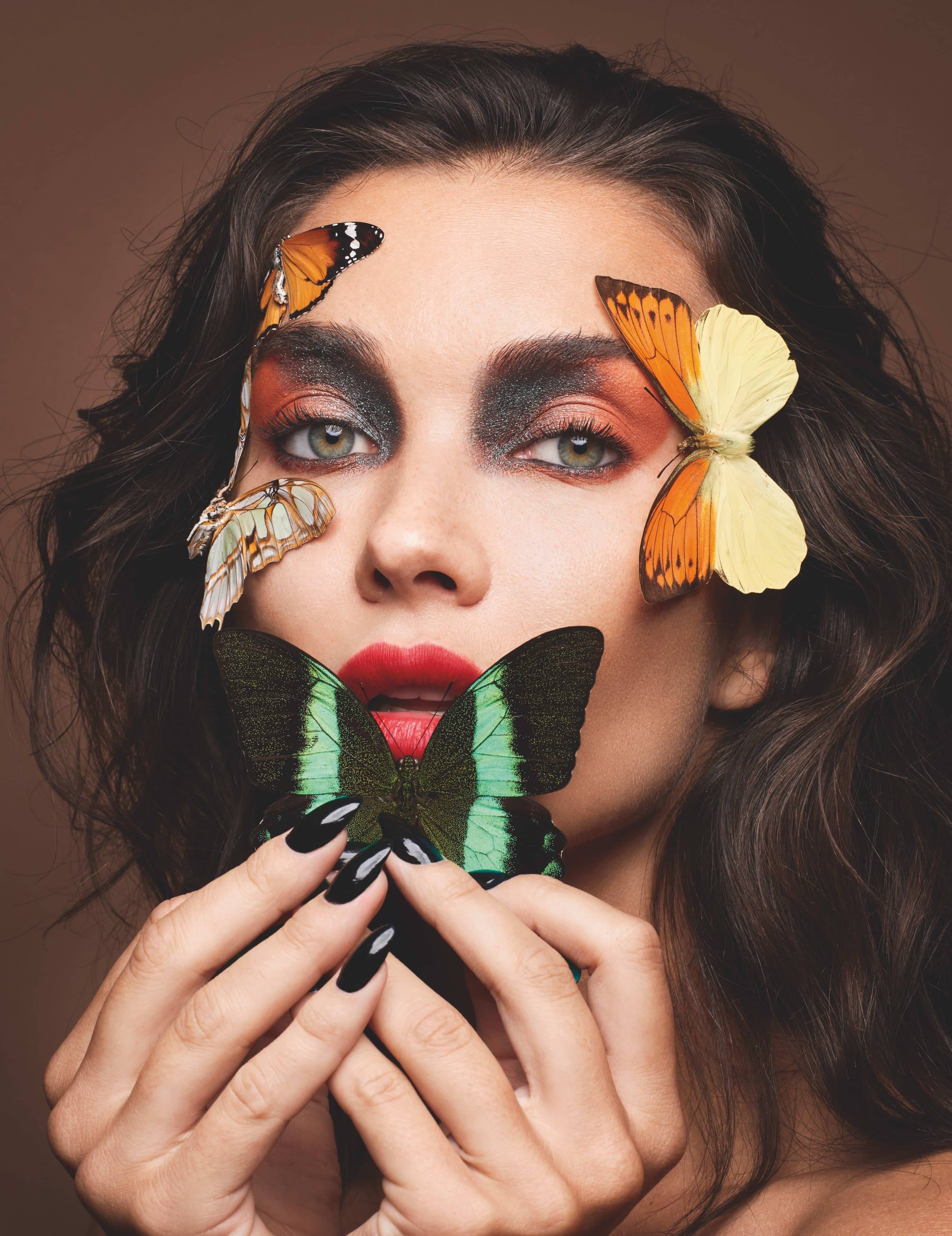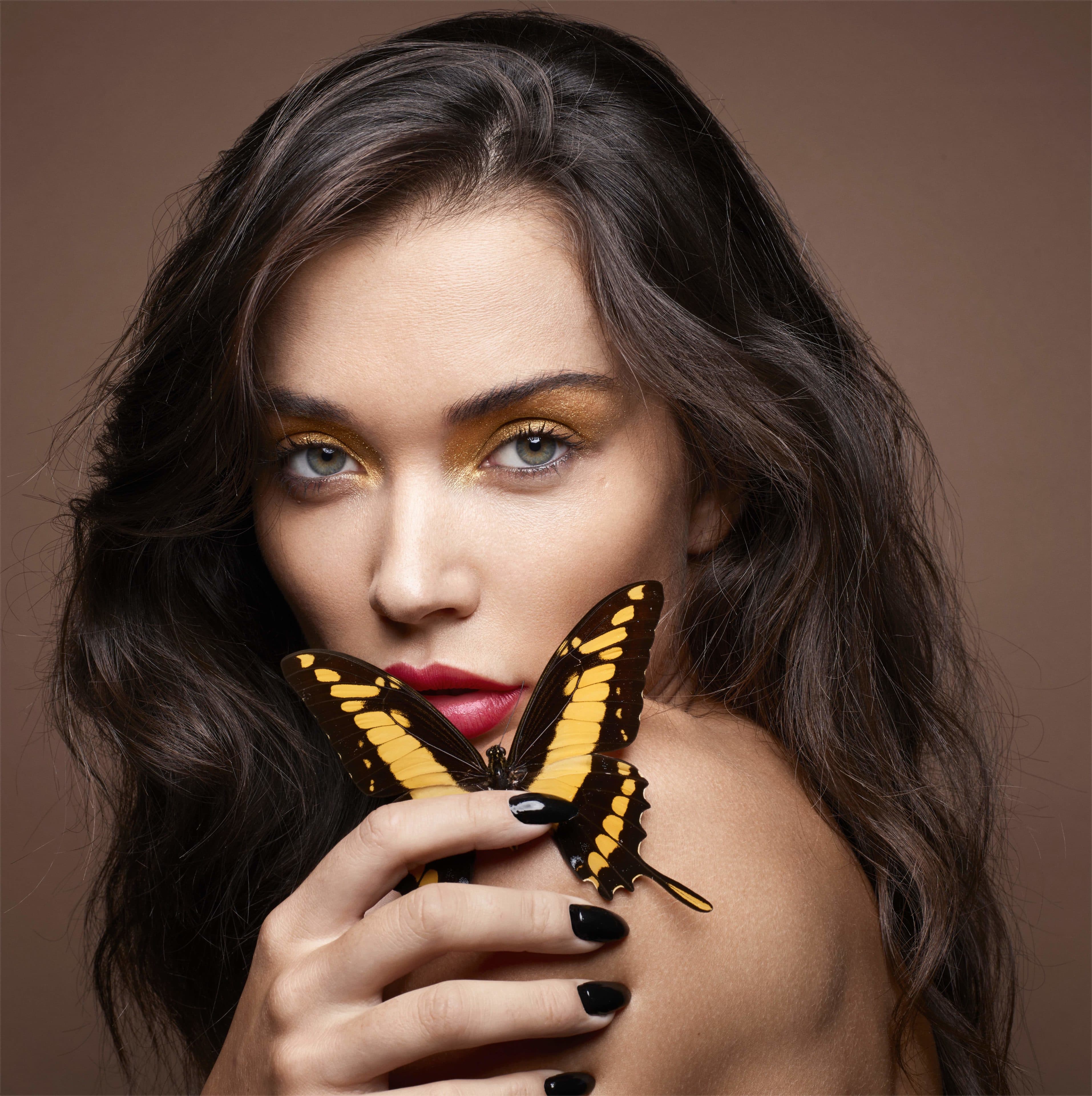 Amy wears GUERLAIN Abeille Royale Double R Renew & Repair Advanced Serum, GUERLAIN Parure Gold Skin Foundation in 3N Neutral and GUERLAIN Les Voilettes Mattifying Translucent Loose Powder in Clair on skin, GUERLAIN Terracotta Light in 03 Medium Warm on cheeks, GUERLAIN Ombres G Eyeshadow Quad in 555 Metal Butterfly, Guerlain Le Crayon Yeux Waterproof Liner in 01 Black Ebony and GUERLAIN Noir G Mascara in 01 Black on eyes and GUERLAIN Rouge G Luxurious Velvet Metal Lipstick in 214 Exotic Red on lips.