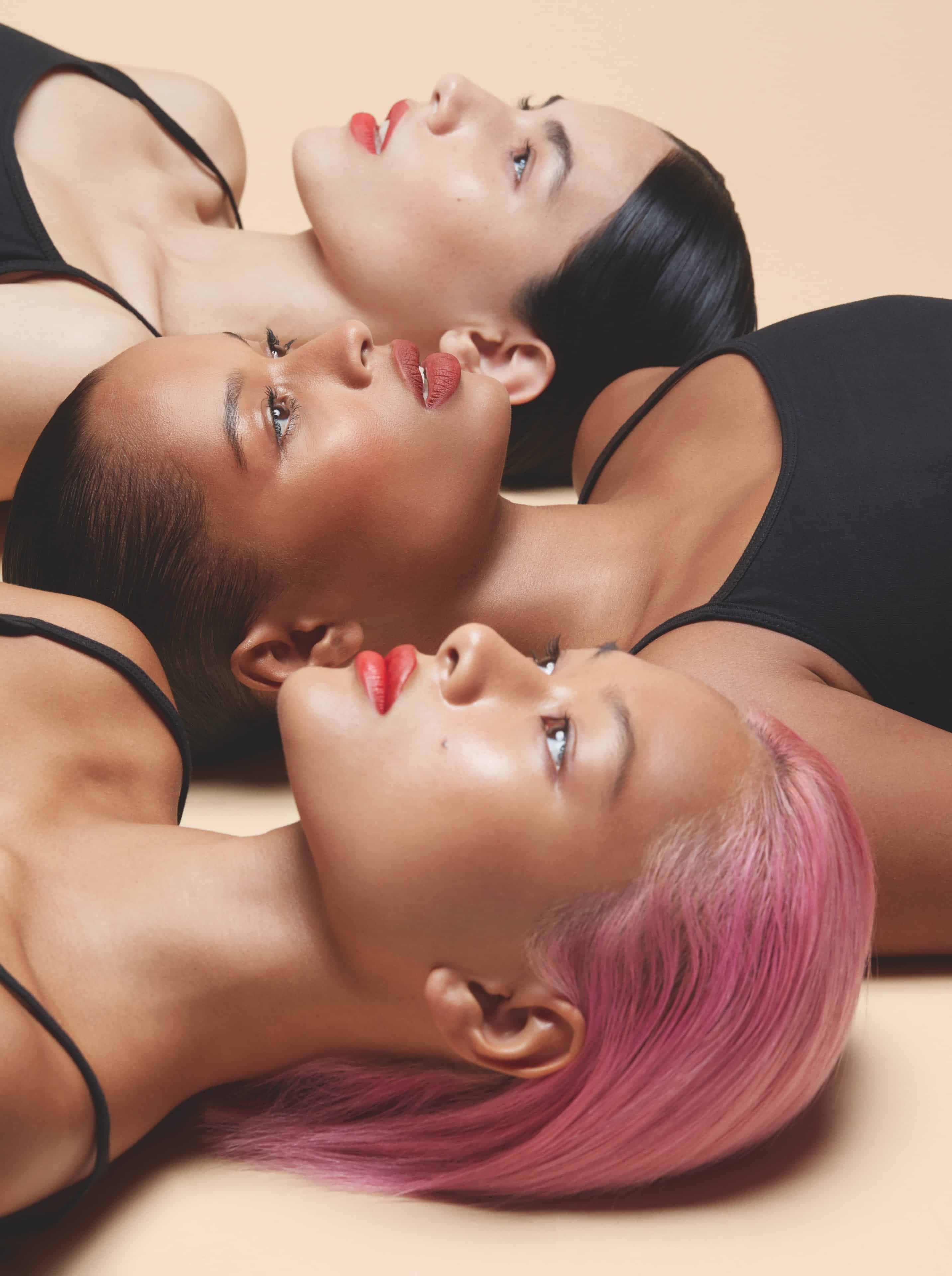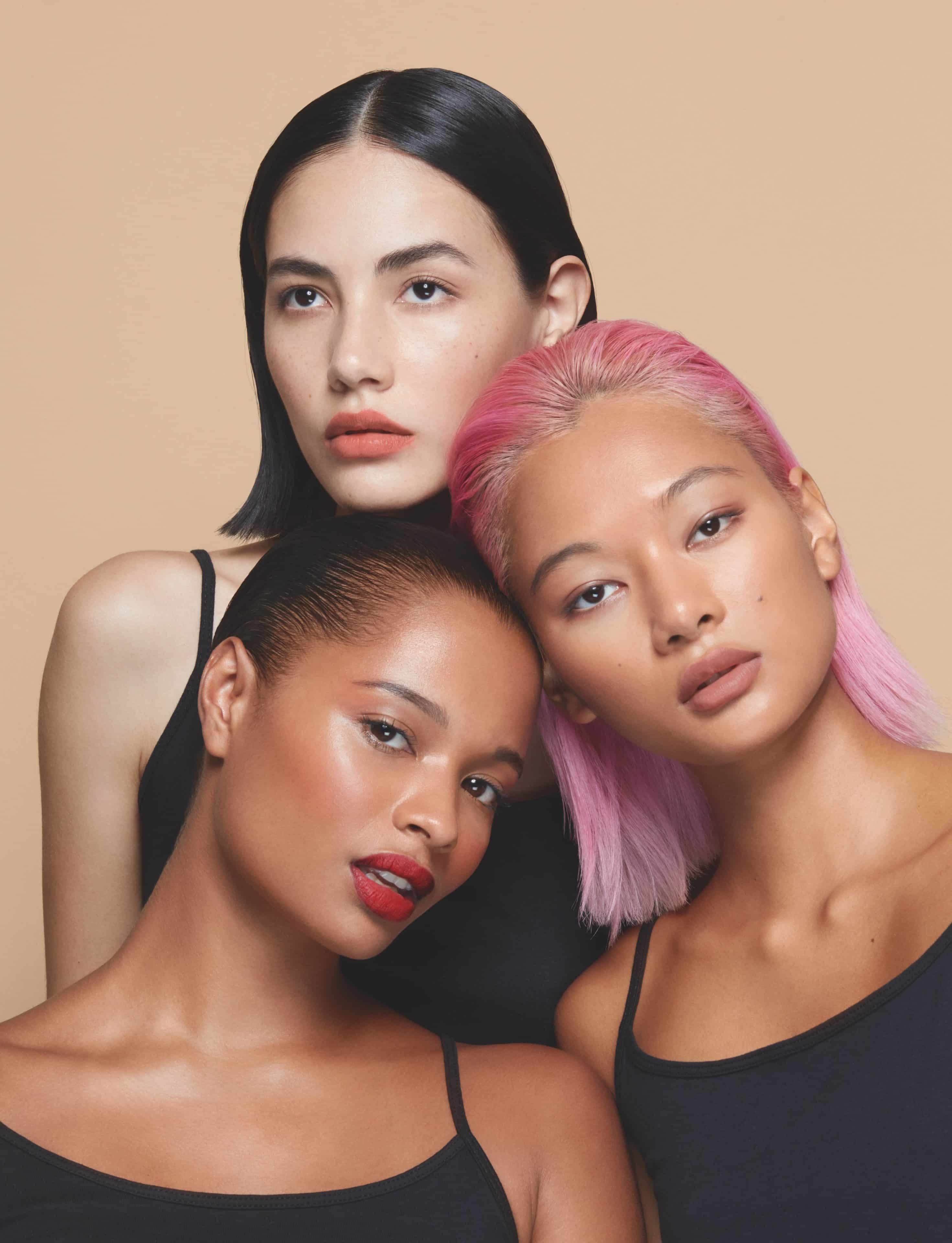 FROM LEFT: Veronica wears NARS Natural Radiant Longwear Foundation in Mont Blanc and NARS Soft Velvet Loose Powder in Flesh on skin, NARS Brow Perfector in Atacama on brows, NARS Extreme Effects Eyeshadow Palette and NARS Climax Mascara in Black on eyes, NARS Blush in Orgasm on cheeks and NARS Powermatte Lipstick in 115 Thunder Kiss on lips. Audrey wears NARS Natural Radiant Longwear Foundation in Belem and NARS Soft Velvet Loose Powder in Desert on skin, NARS Brow Perfector in Atacama on brows, NARS Extreme Effects Eyeshadow Palette and NARS Climax Mascara in Black on eyes, NARS Blush in Liberté on cheeks and NARS Powermatte Lipstick in 120 Indiscreet on lips. Minmie wears NARS Natural Radiant Longwear Foundation in Tahoe and NARS Soft Velvet Loose Powder in Eden on skin, NARS Brow Perfector in Goma on brows, NARS Extreme Effects Eyeshadow Palette and NARS Climax Mascara in Black on eyes, NARS Blush in Lustre on cheeks and NARS Powermatte Lipstick in 100 Sweet Disposition on lips.