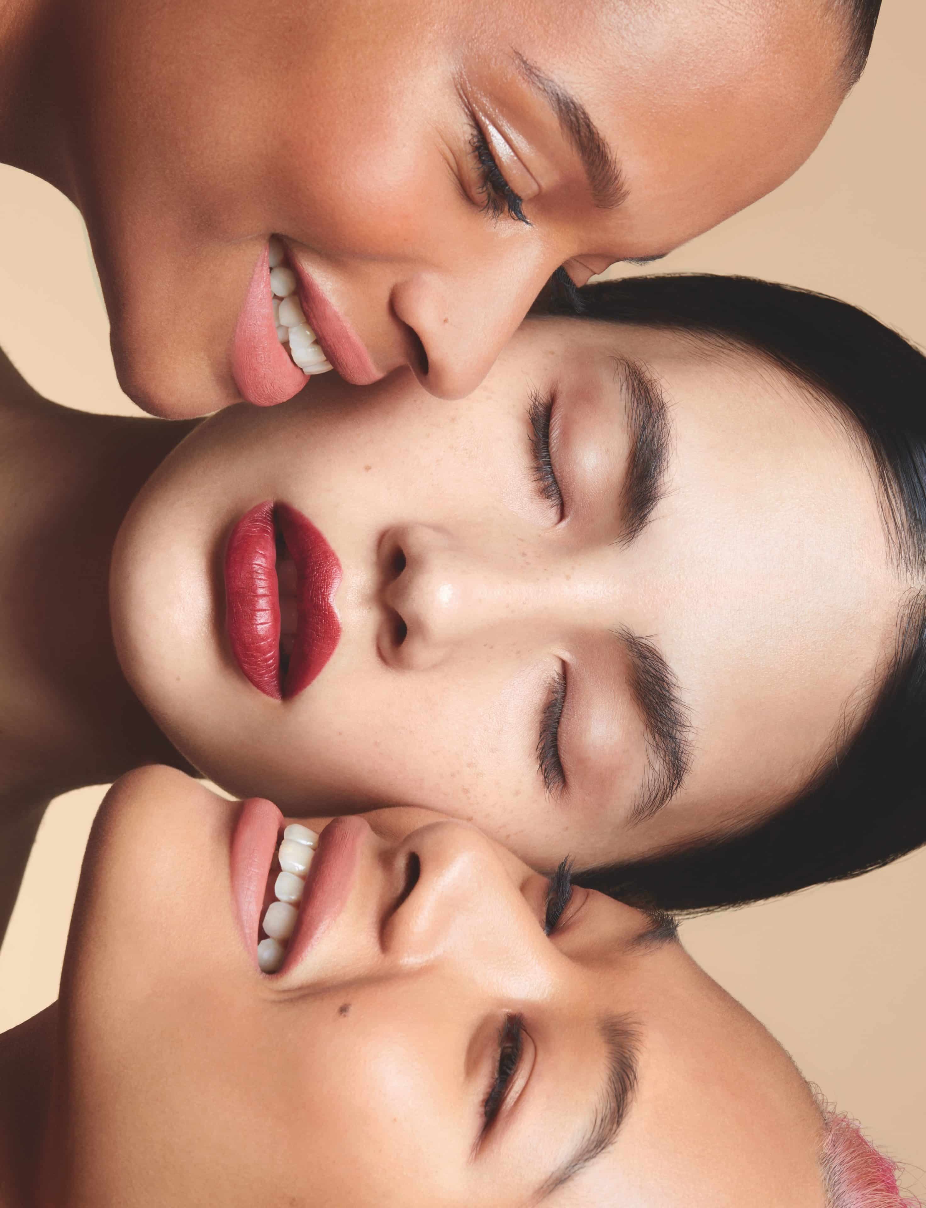FROM TOP: Veronica wears NARS Natural Radiant Longwear Foundation in Mont Blanc and NARS Soft Velvet Loose Powder in Flesh on skin, NARS Brow Perfector in Atacama on brows, NARS Extreme Effects Eyeshadow Palette and NARS Climax Mascara in Black on eyes, NARS Blush in Orgasm on cheeks and NARS Powermatte Lipstick in 120 Indiscreet on lips. Audrey wears NARS Natural Radiant Longwear Foundation in Belem and NARS Soft Velvet Loose Powder in Desert on skin, NARS Brow Perfector in Atacama on brows, NARS Extreme Effects Eyeshadow Palette and NARS Climax Mascara in Black on eyes, NARS Blush in Liberté on cheeks and NARS Powermatte Lipstick in 133 Too Hot to Hold on lips. Minmie wears NARS Natural Radiant Longwear Foundation in Tahoe and NARS Soft Velvet Loose Powder in Eden on skin, NARS Brow Perfector in Goma on brows, NARS Extreme Effects Eyeshadow Palette and NARS Climax Mascara in Black on eyes, NARS Blush in Lustre on cheeks and NARS Powermatte Lipstick in 131 Notorious on lips.