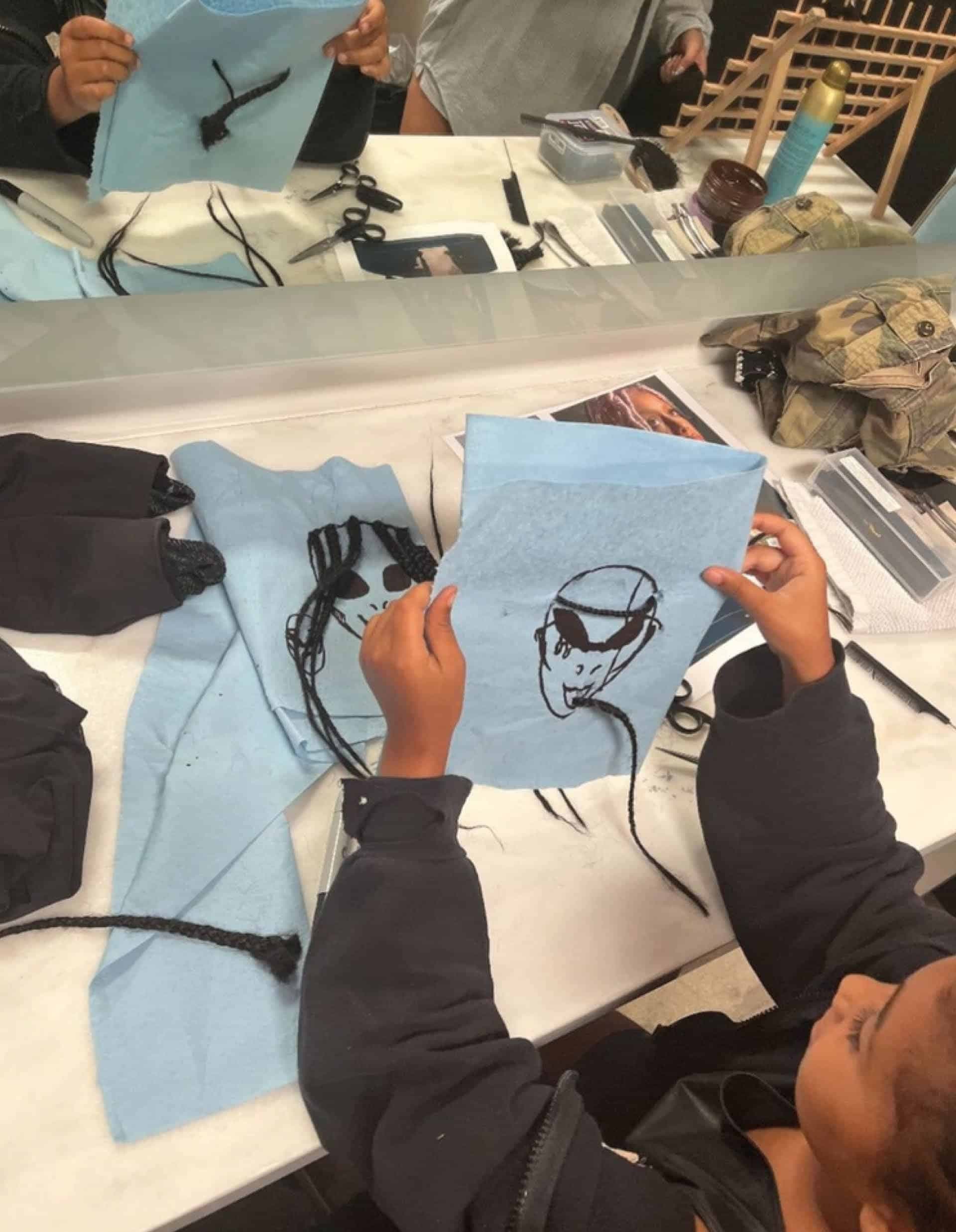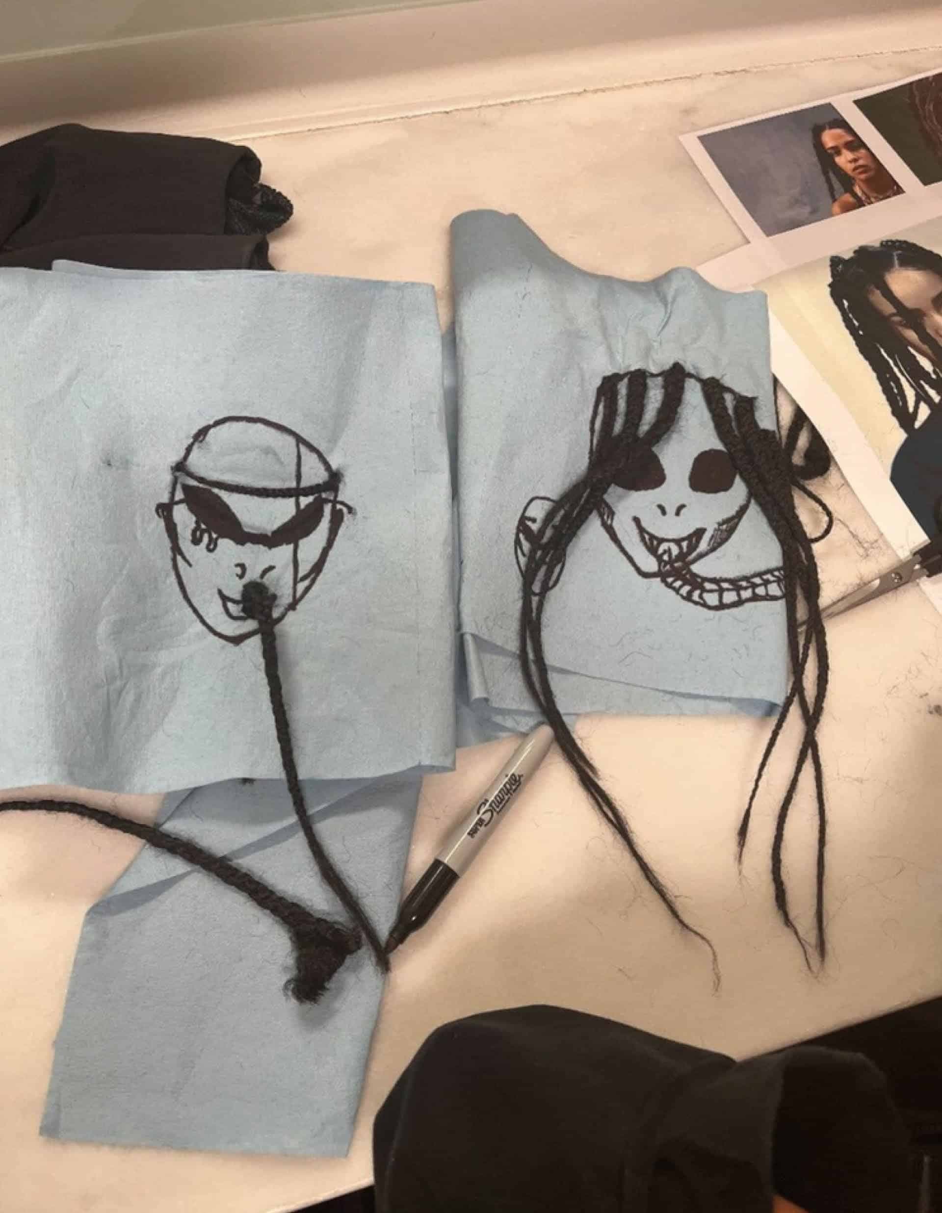 In one photo, West can be seen holding up one of her alien-like sketches done on a piece of blue paper, donning a pair of shades with what appears to be a real braid of hair sticking out of the figure’s mouth.