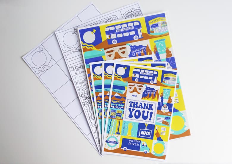 Illustrator Erin Aniker says ‘Thank you skilled key workers!’ in a new series of posters, postcards and activity sheets developed from one artwork, paying tribute to NHS workers, corner shops, cleaners and bus and delivery drivers, which the artist has been working on every day since lockdown and is now proud to release for a vital cause.