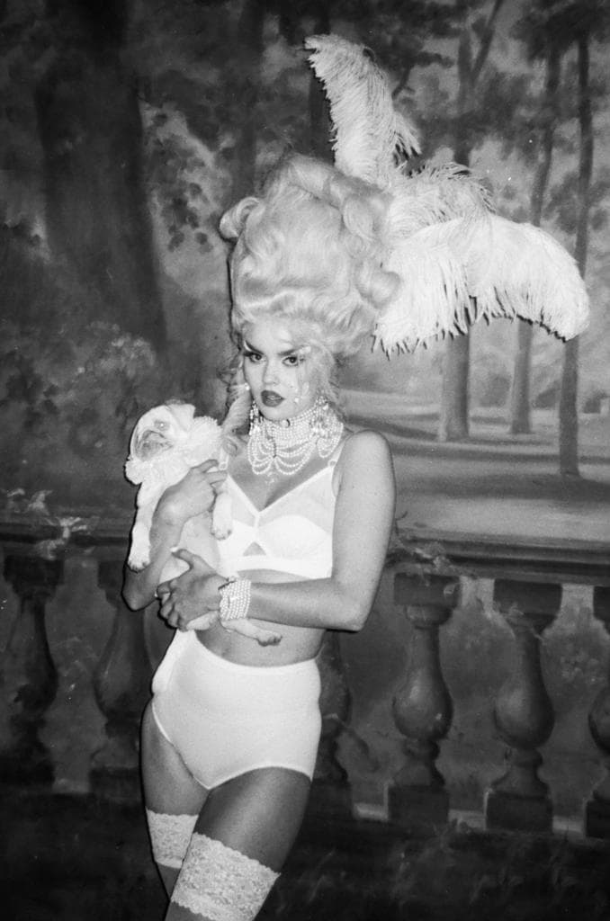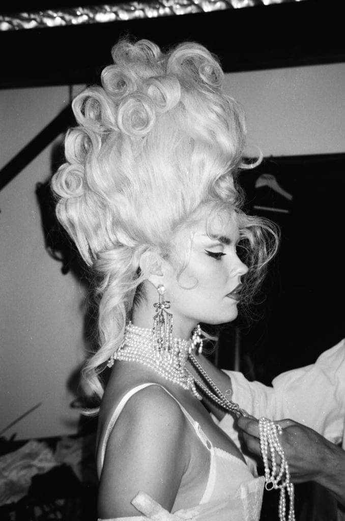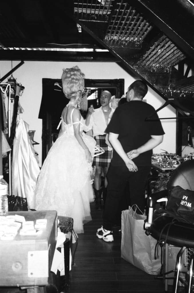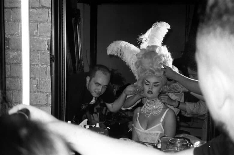 DS: I just want to say, I really appreciate you for being in BITCHES full-stop — being involved, and believing in it and in me. It’s really interesting that looking back your shoot is the only one I have proper BTS of. It’s one of my favourite pictures from the show, and we actually have documentation of it being made. I’m really proud of the picture, I think it’s a real testament to you as an individual; who you are, and what you stand for. Also, I think it’s a result of the amazing talent we worked with on the day – including the incredible Westwood design, Terry Barber on make-up, and Oscar Pera doing hair. Your image is a real product of fine British talent, even though it’s a French-inspired character.