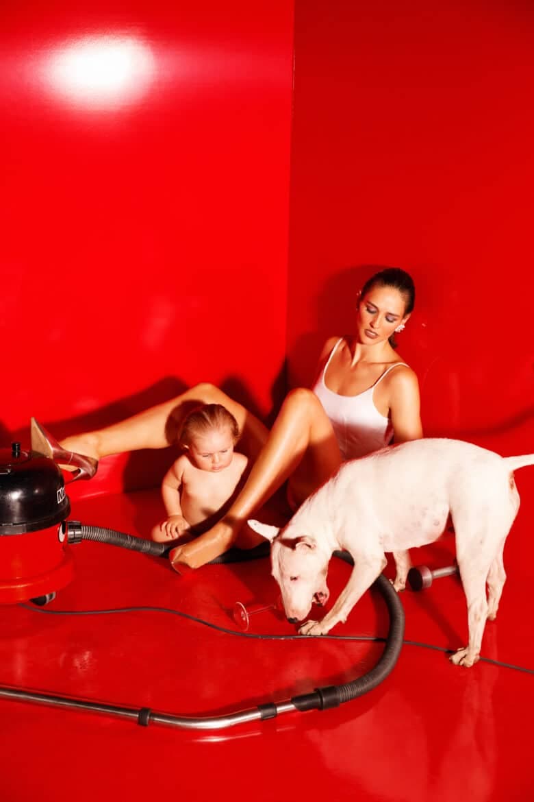 BS: I remember the outfit I wore super well. Before the day on set, I knew what the character was going to be, but I didn’t know exactly what I was going to be wearing. When I got in and I saw that it was a Vivienne Westwood wedding couture, I was honestly beside myself. It’s the best thing I’ve ever been able to wear on a shoot. It felt just so expensive and lovely which meant being positioned on top of a cake was the scariest thing ever. I had people being like “don’t ruin the dress, don’t ruin the dress” and then Daniel was just like “get in the camera, get in the camera”. The minute the dogs were doing the right thing, it was like all the stress was on but, as Daniel said, it just spontaneously connects and everything suddenly came together.