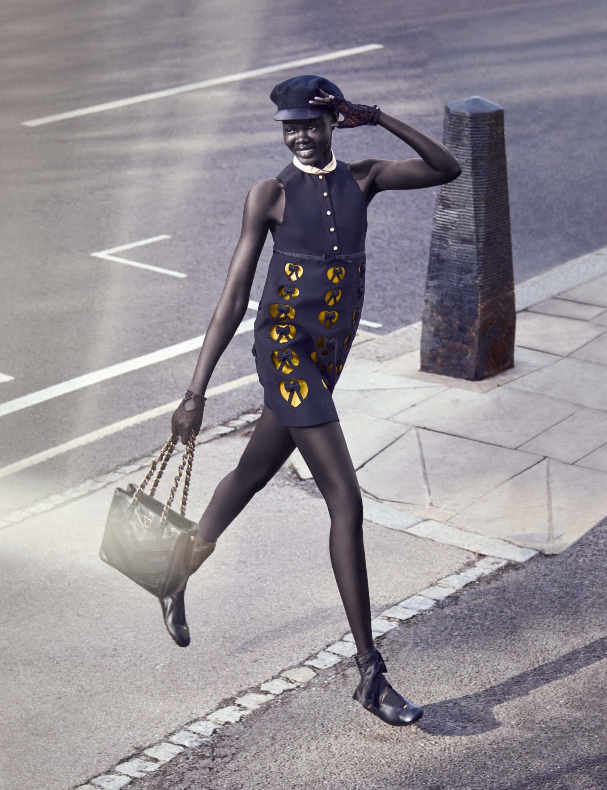 Kuany wears dress by VALENTINO and shoes, gloves, hat and bag by VALENTINO GARAVANI.