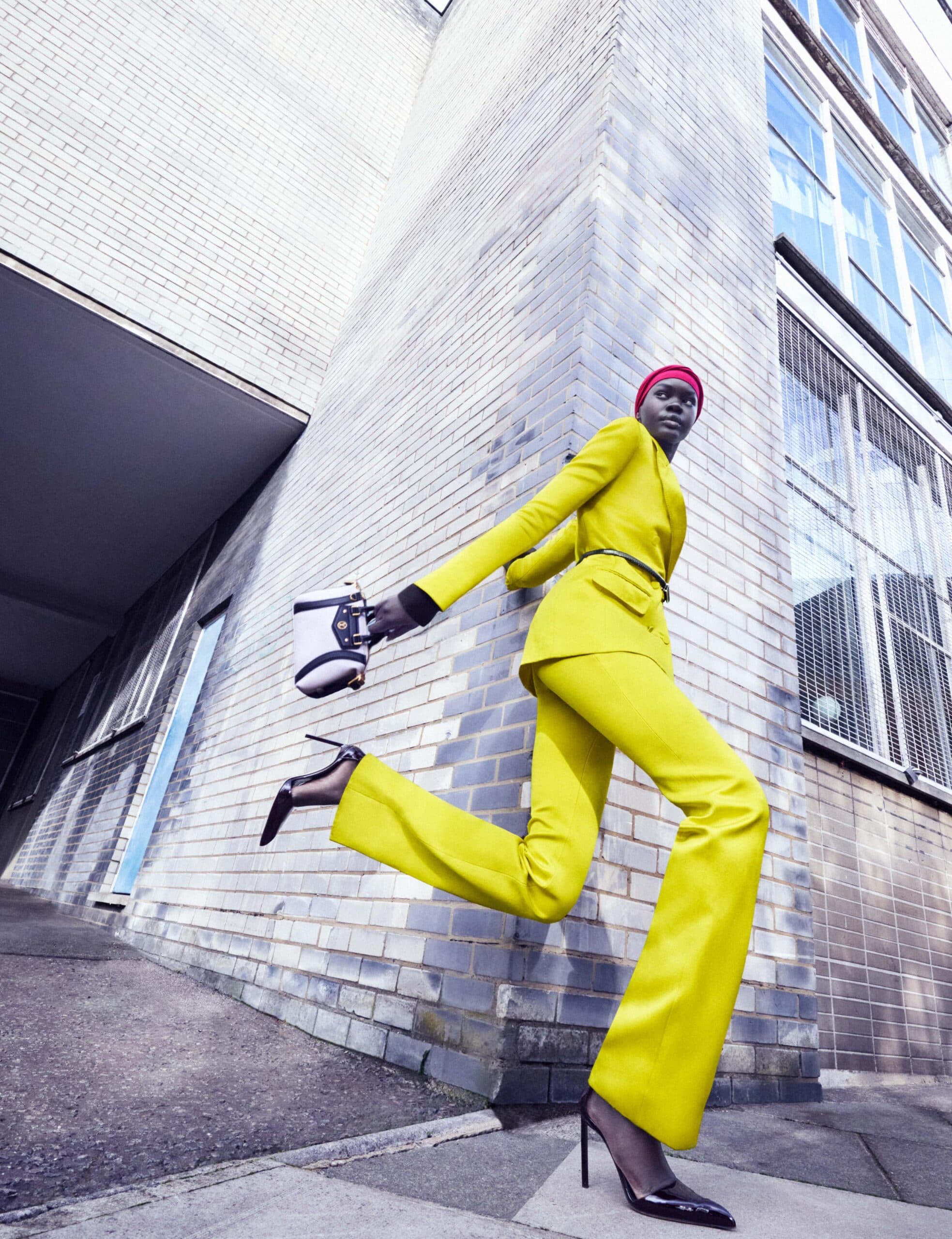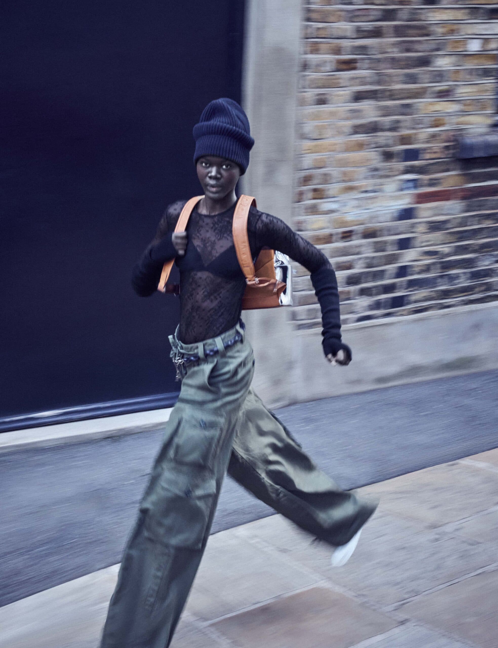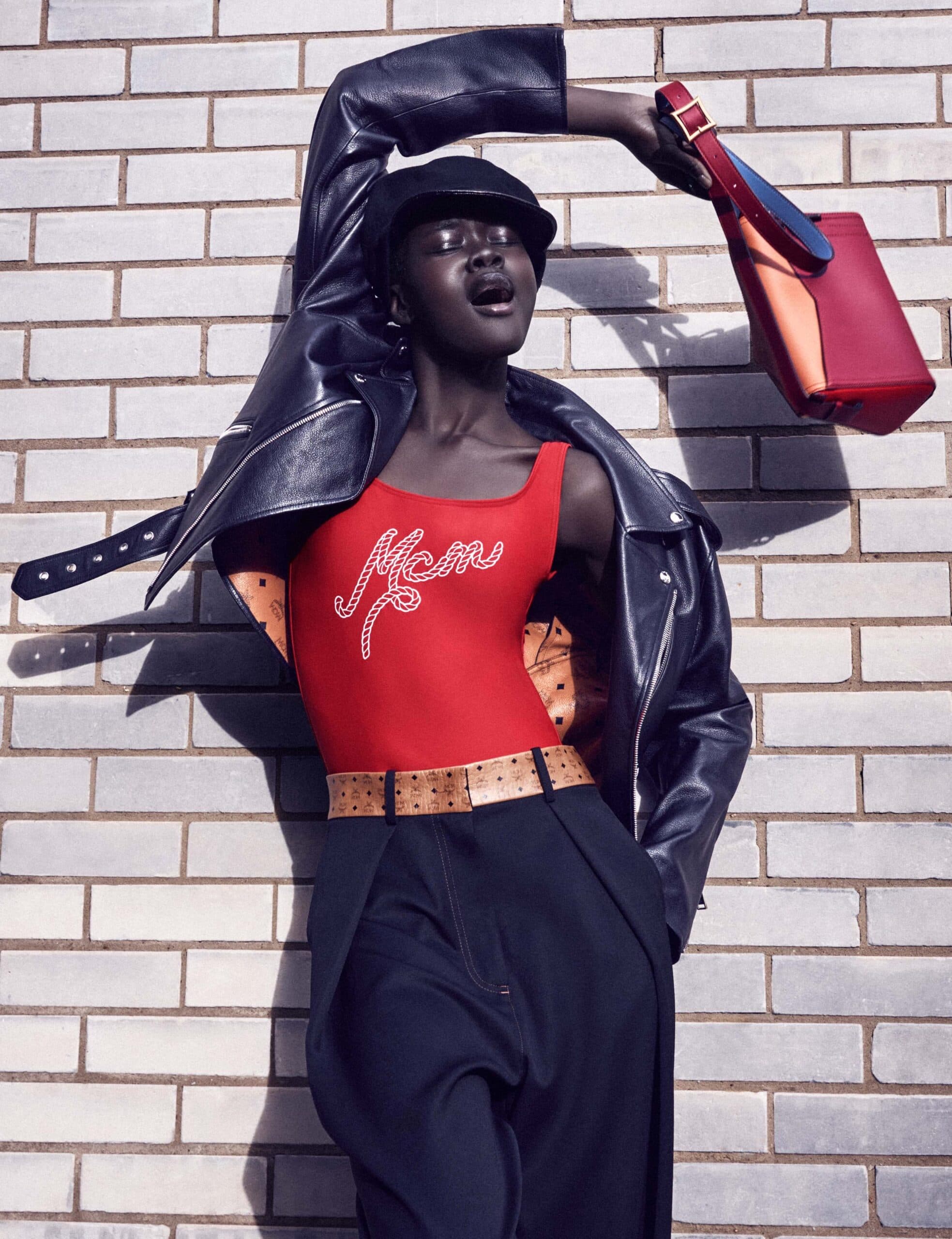 Kuany wears jacket, bodysuit, trousers and bag by MCM and hat by VALENTINO GARAVANI.