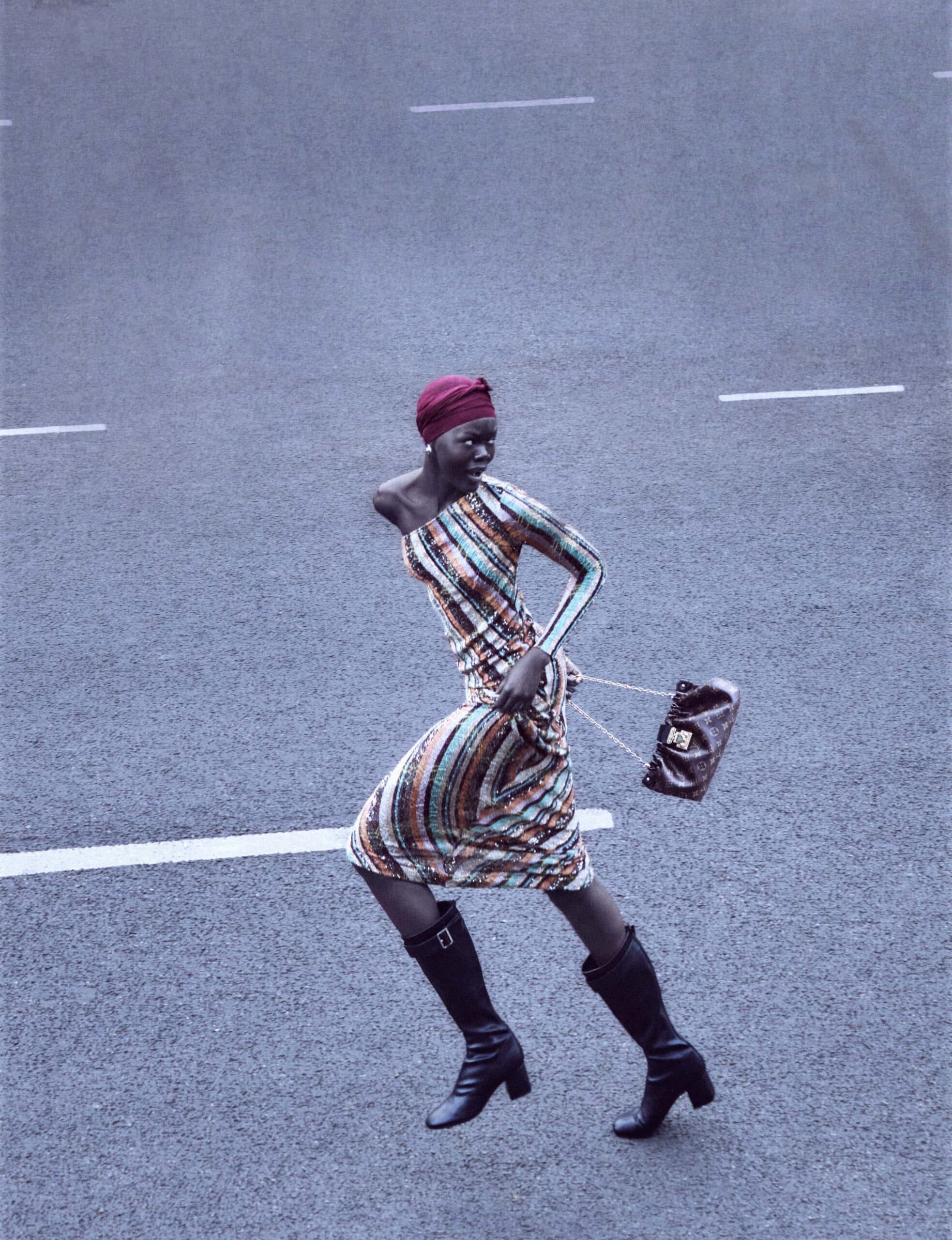 Kuany wears dress by MISSONI, boots by CHARLES & KEITH, headscarf by WOLFORD, bag by LOUIS VUITTON and earrings by TOM WOOD.