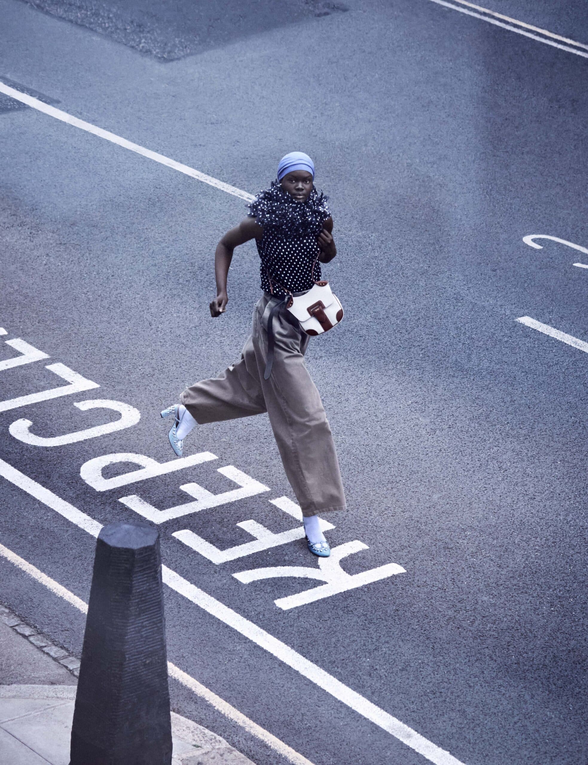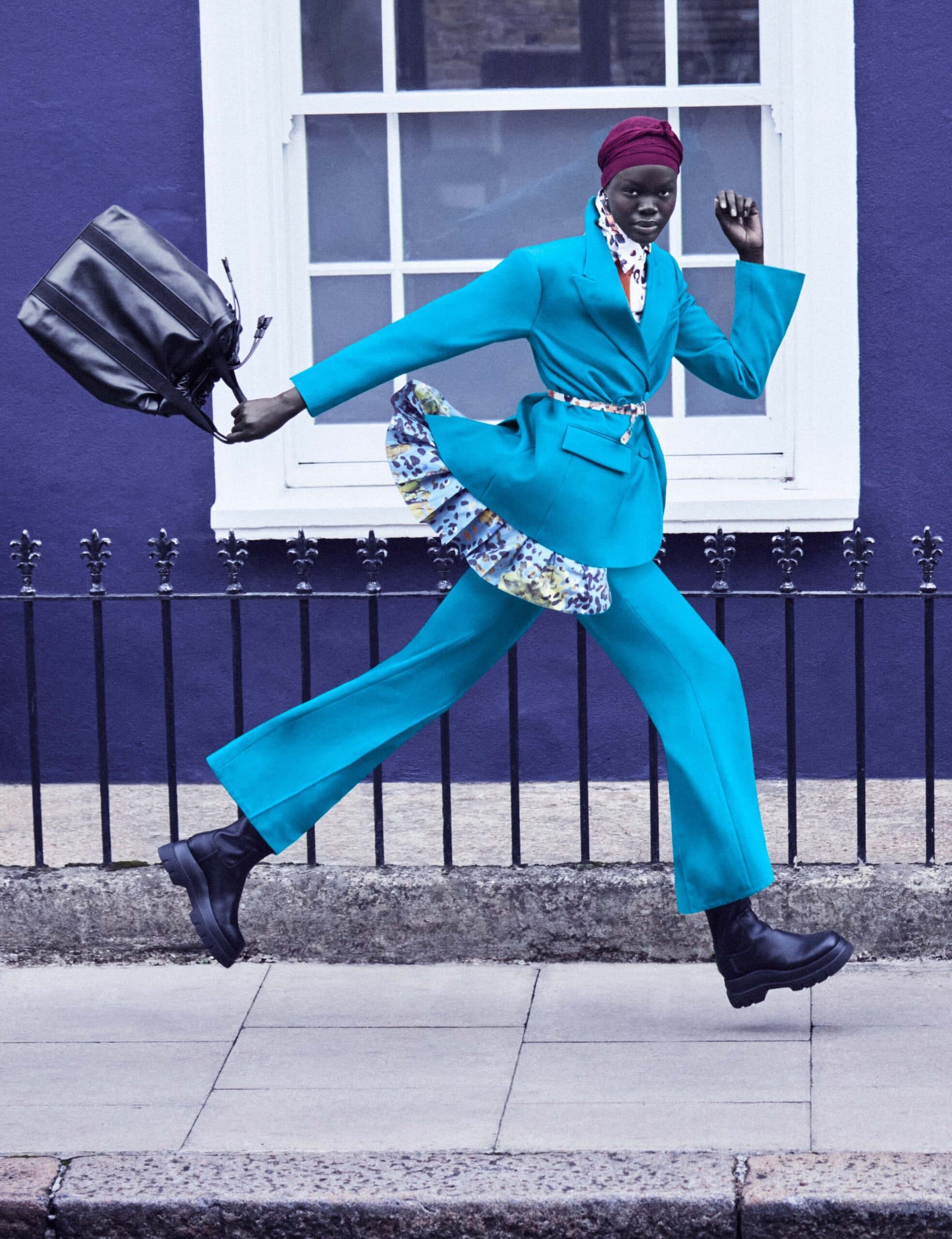 Kuany wears jacket, dress, trousers, belt and bag by FENDI, boots by CHARLES & KEITH, headscarf by WOLFORD and earrings by TOM WOOD.