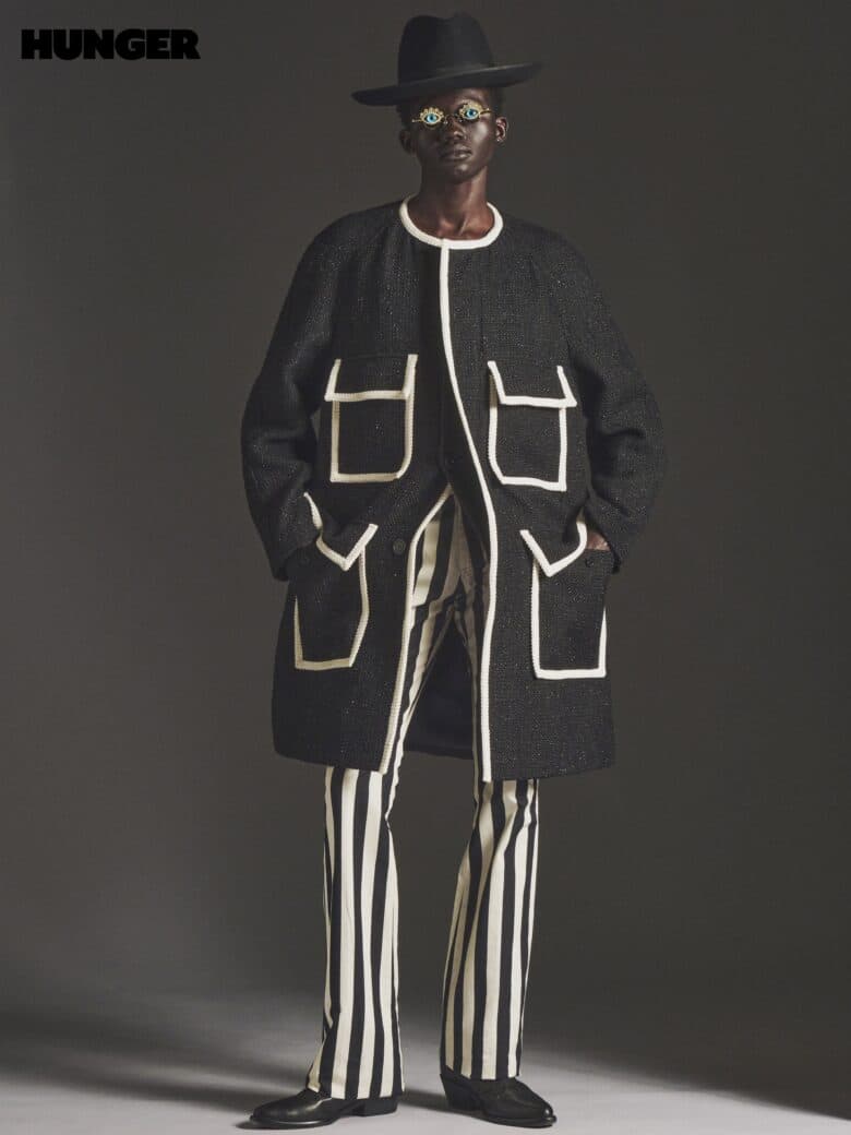 Manyuon wears Coat and Trousers by BALMAIN, Boots by ISABEL MARANT, Hat by MAISON MICHELLE Pari and Archive Glasses.