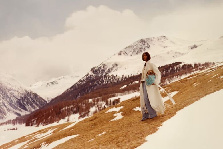 Off the runway and in front of Dodgson’s lens, the collection is set against a backdrop of sprawling, snowy mountains — and it gets an extra boost from some furry friends. One shot features a model on horseback, sporting Damier-check denim and Louis Vuitton’s ultra-luxe Timberlands. In another, the same horse nuzzles a pixelated “Damoflage” puffer.